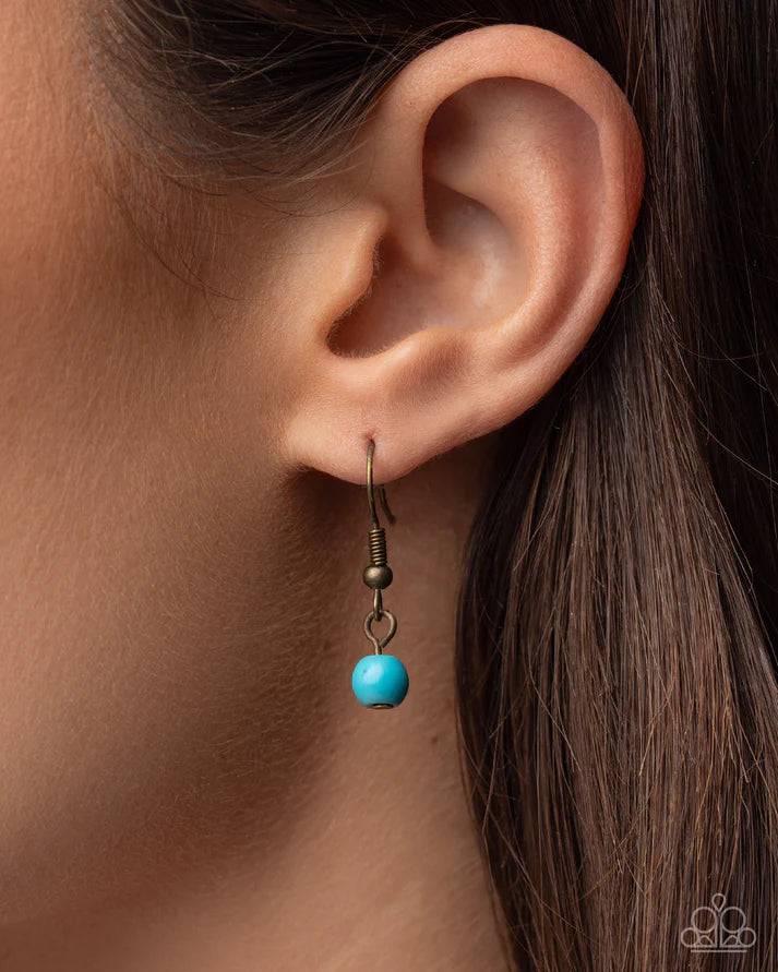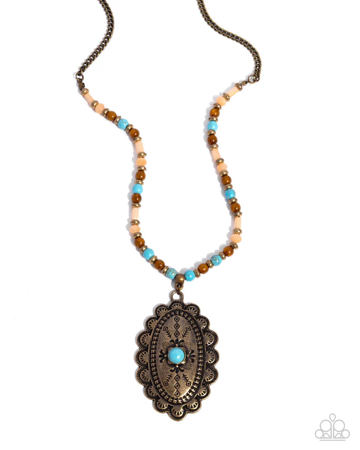 Attached to a classic brass chain, a collection of brass discs, turquoise stone beads, Bronze Brown beads, and faceted light orange beads in varying shapes patterns and coalesces around the neckline. An elaborately whimsical motif-stamped oval fringed disc with a turquoise stone center sways from the center of the display for a rustic finish. Features an adjustable clasp closure. As the stone elements in this piece are natural, some color variation is normal.