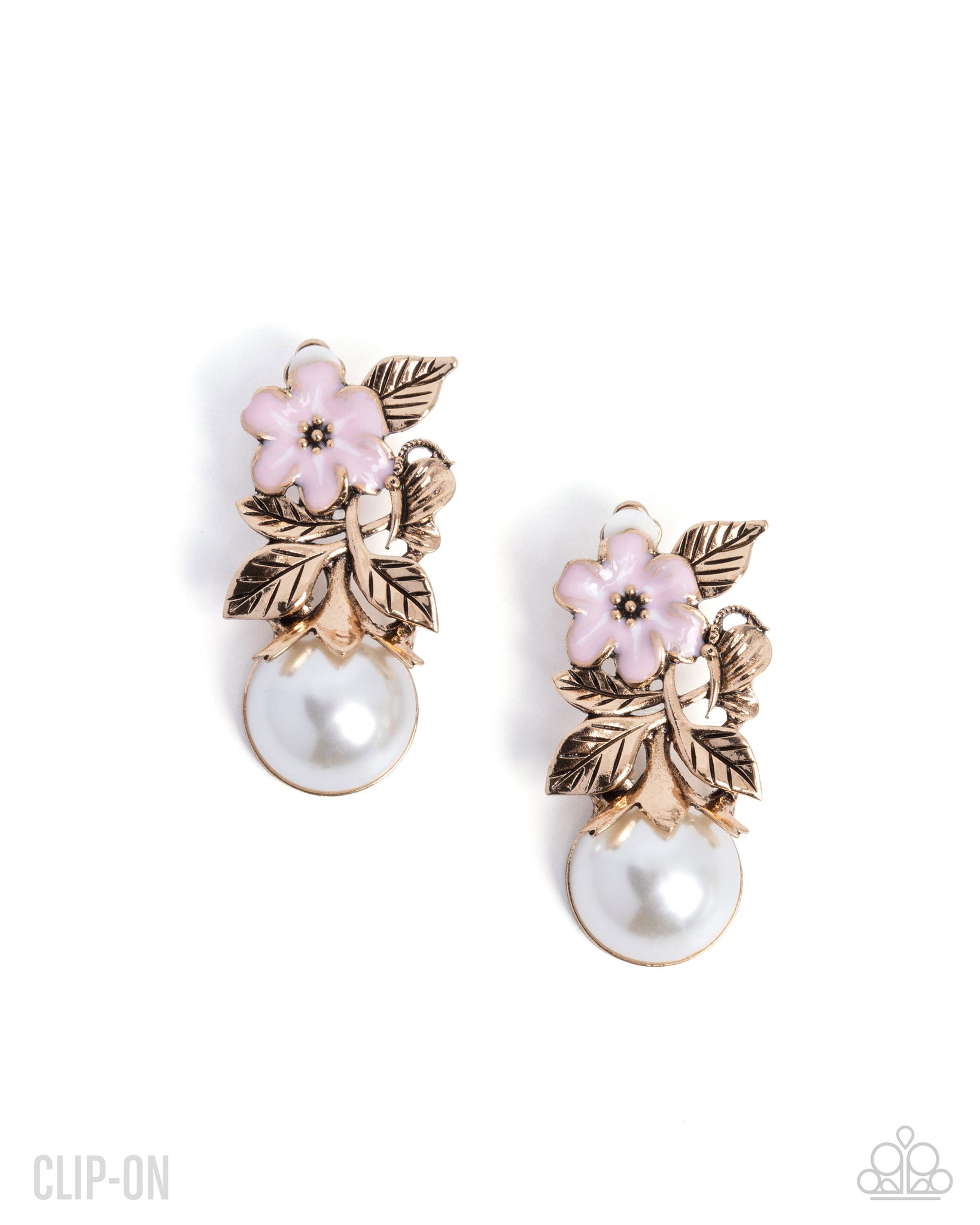 Delicate, pink-painted floral accents and intricately detailed golden leaves cascade into a lustrous pearl, creating a vintage-inspired elegance. The floral details are highlighted with soft pastel hues for a chic look. Earring attaches to a standard clip-on fitting.