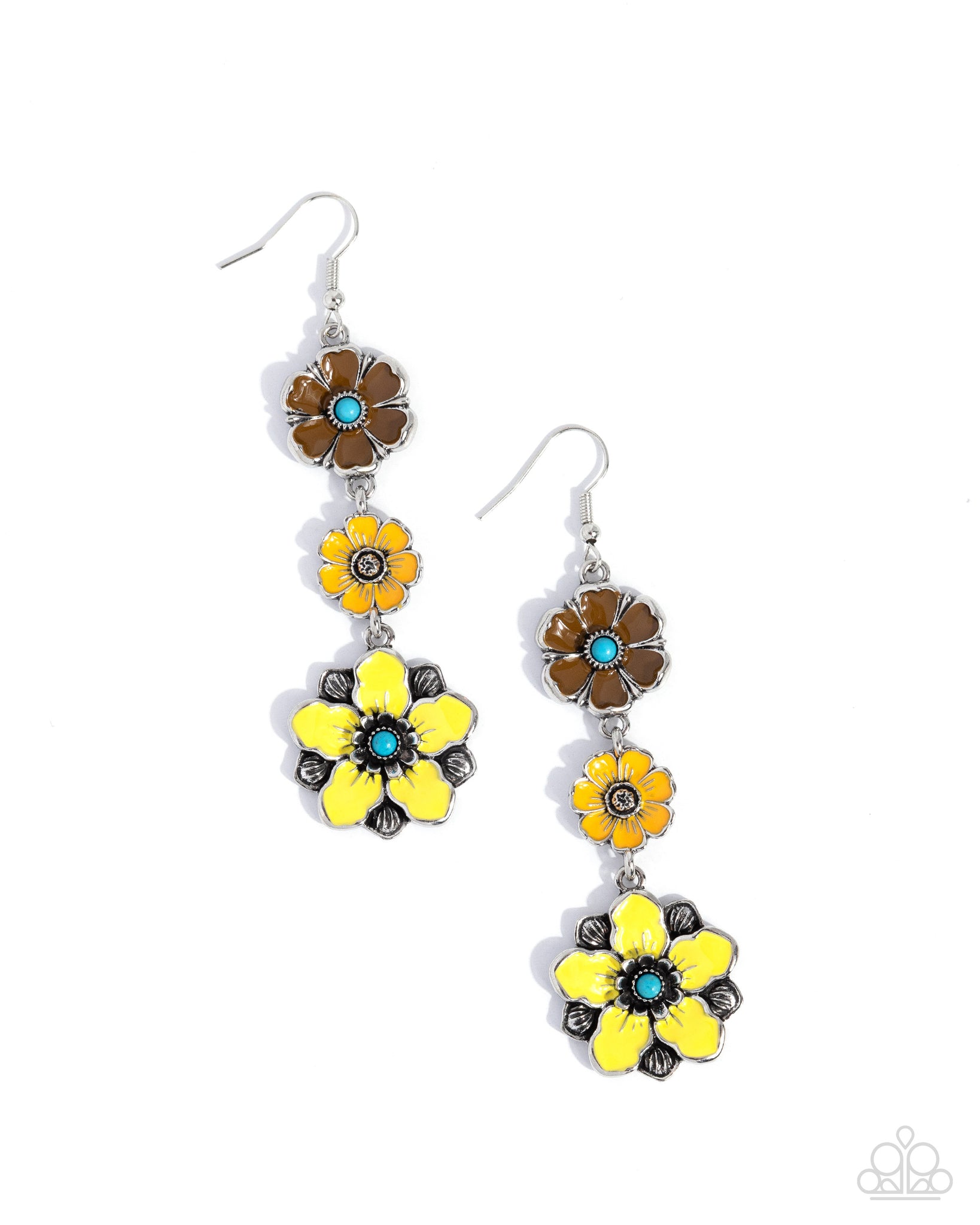 Featuring turquoise stone and silver-studded centers, three silver flowers with Bronze Brown, Saffron, and Primrose hues delicately link and elongate into a whimsically refined lure. Earring attaches to a standard fishhook fitting. As the stone elements in this piece are natural, some color variation is normal.