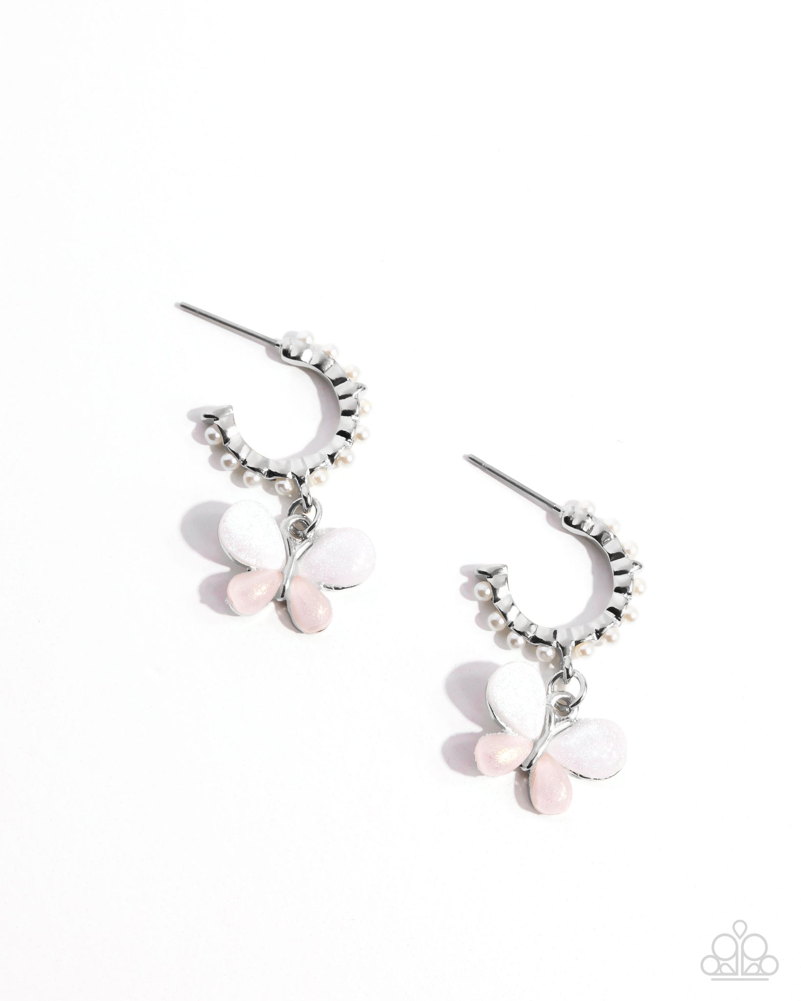 Pressed in a scalloped silver fitting, white pearls curl around the ear for a refined fashion giving way to a silver butterfly with white and baby pink sparkly resin wings for a whimsically sophisticated look. Earring attaches to a standard post fitting. Hoop measures approximately 5/8" in diameter.