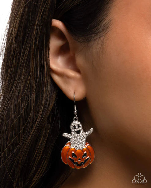 Dusted in glistening white rhinestones, a silver ghost with black-painted details pops out of a pearl-painted orange jack-o-lantern with similar black-painted details for a Halloween-inspired haute look. Earring attaches to a standard fishhook fitting.