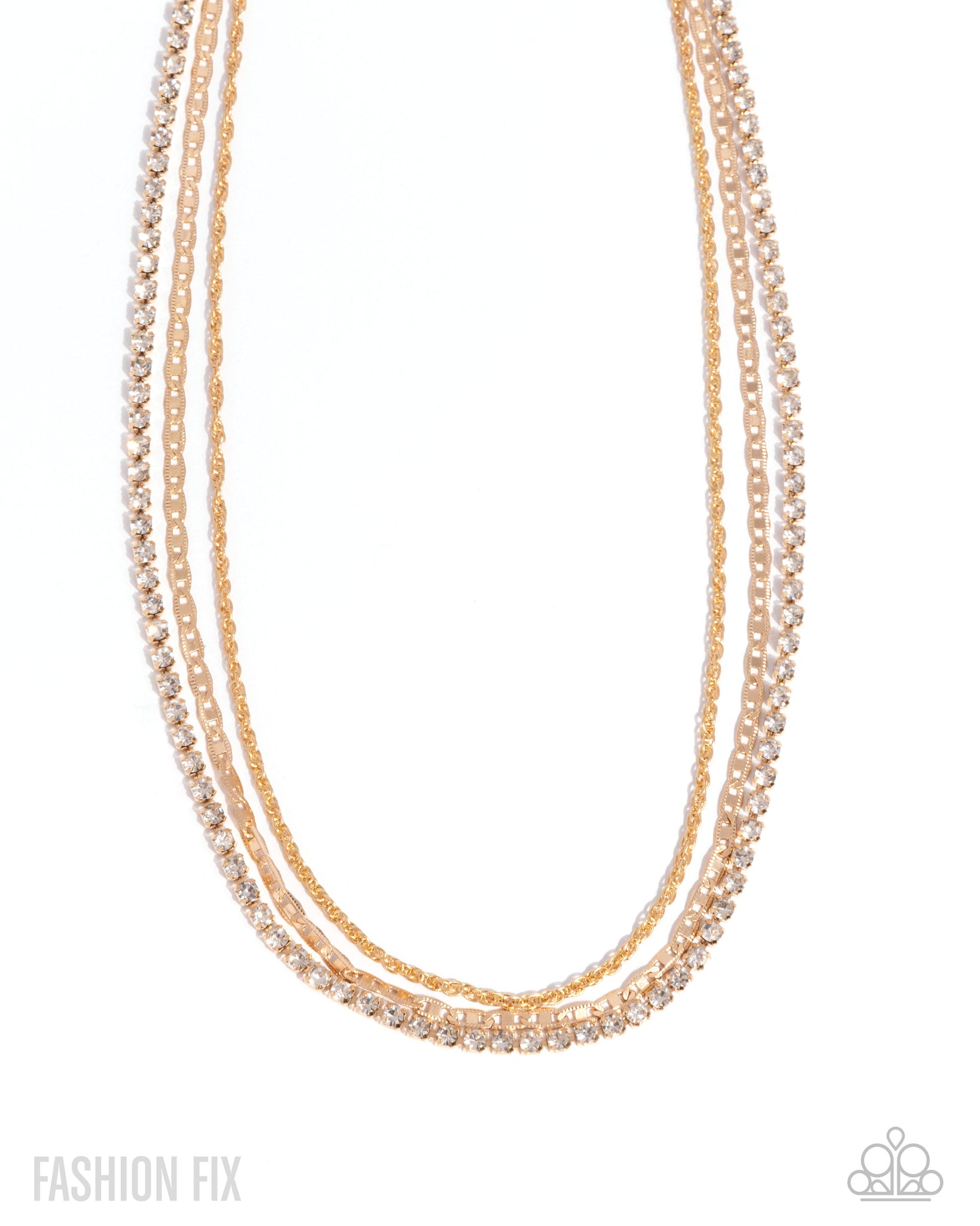 Featuring a mix of dainty textured and cable gold chains, a row of faceted, dainty white rhinestones encased in sleek gold frames, joins the eclectic display, reflecting light with every movement for a chic, dimensional look. Features an adjustable clasp closure.