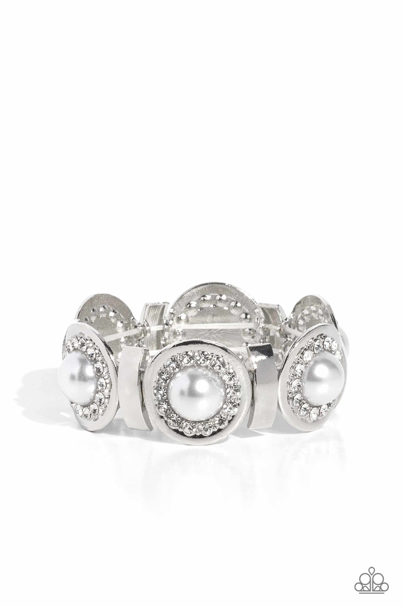 Concaved silver frames, with an embossed row of white gems, encircle an oversized pearl center creating refined flowers. Sleek curls of silver alternate between the bejeweled flowers for additional shine and capricious shimmer along the wrist on stretchy bands.