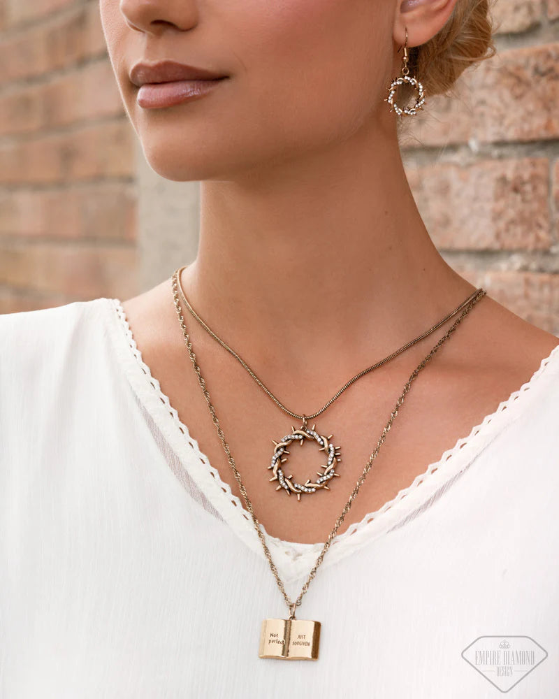 Sporadically dusted in dainty white rhinestones, antiqued gold bars curl into a crown of thorns pendant, gliding along an antiqued gold snake chain. An open book with the words "Not perfect JUST FORGIVEN" stamped atop it glides along an antiqued gold singapore chain, layering below the wreathed pendant for a reverent, radiant reminder. Features an adjustable clasp closure.