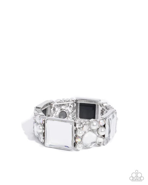 Infused along elastic stretchy bands, elevated faceted clear square gems alternate with clustered framed collections of varying sizes of white pearls, white, iridescent, clear, and opalescent gems for a glamorously glittery display. Due to its prismatic palette, color may vary.