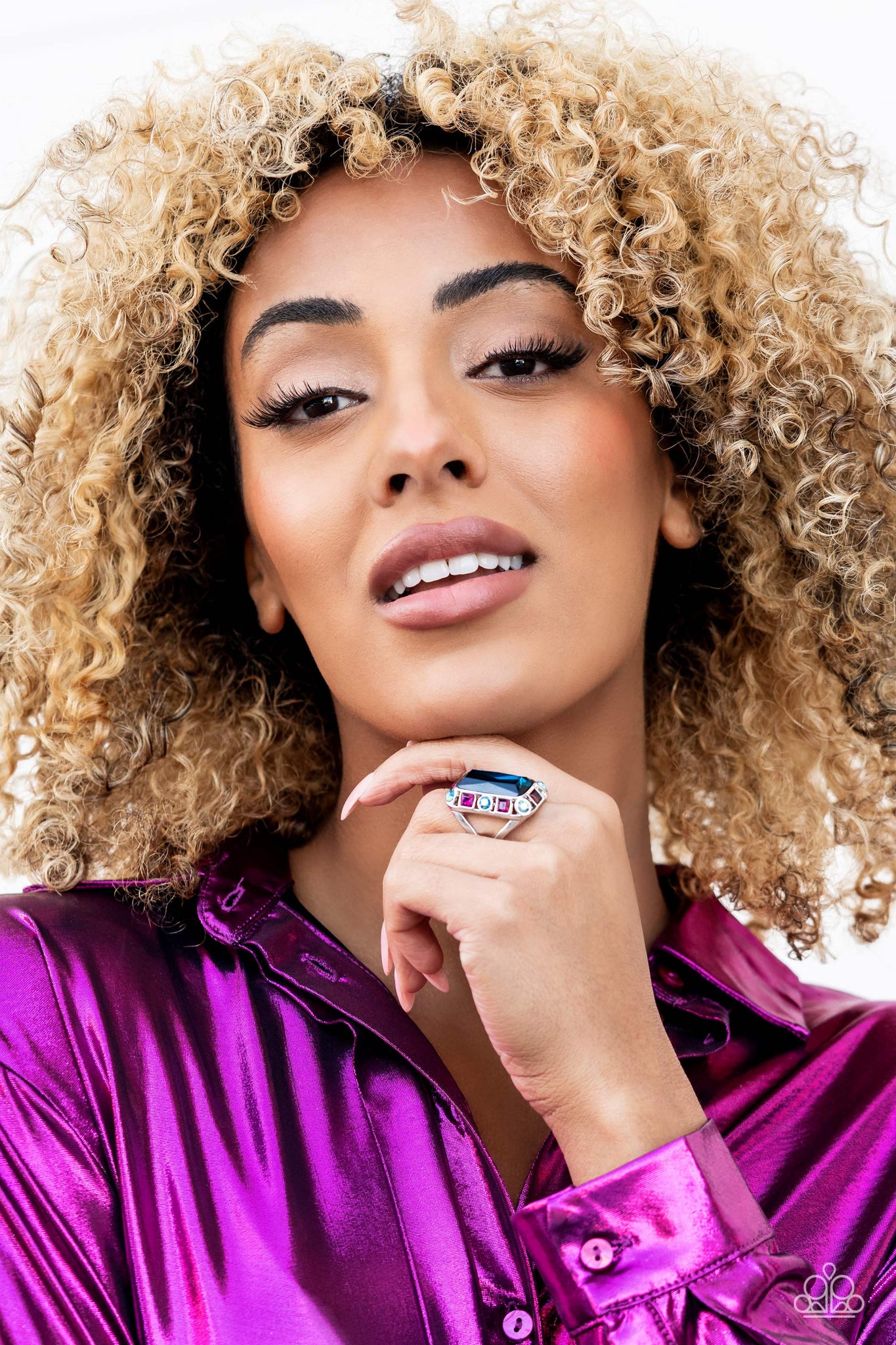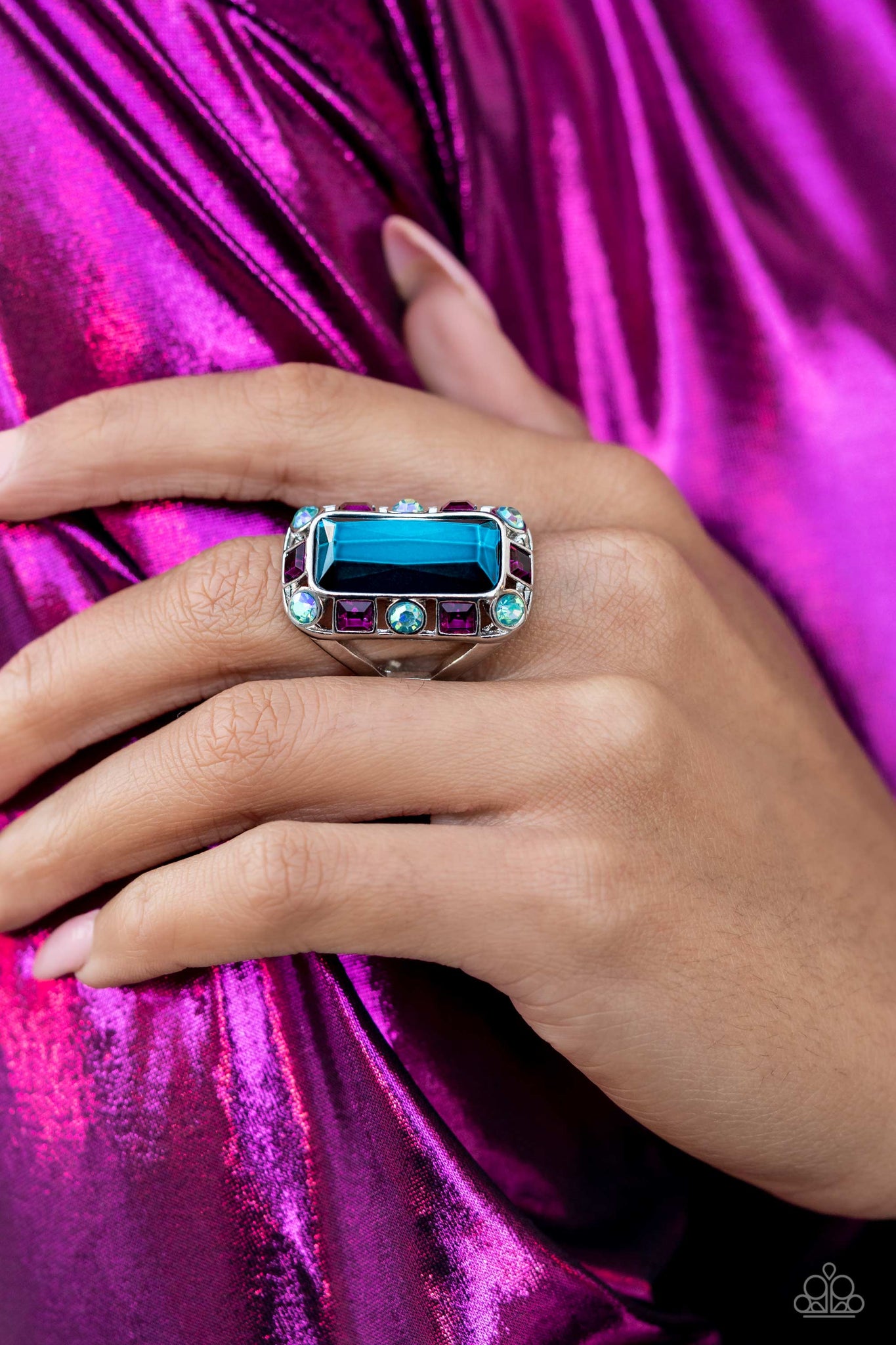 Pressed into a curved, rectangular silver frame, an oversized emerald-cut blue gem shines atop the finger. Dainty square and round gems in shades of fuchsia and iridescent blue airily encircle the oversized gem for some additional shimmer resulting in a radiant centerpiece. Features a stretchy band for a flexible fit. Due to its prismatic palette, color may vary.