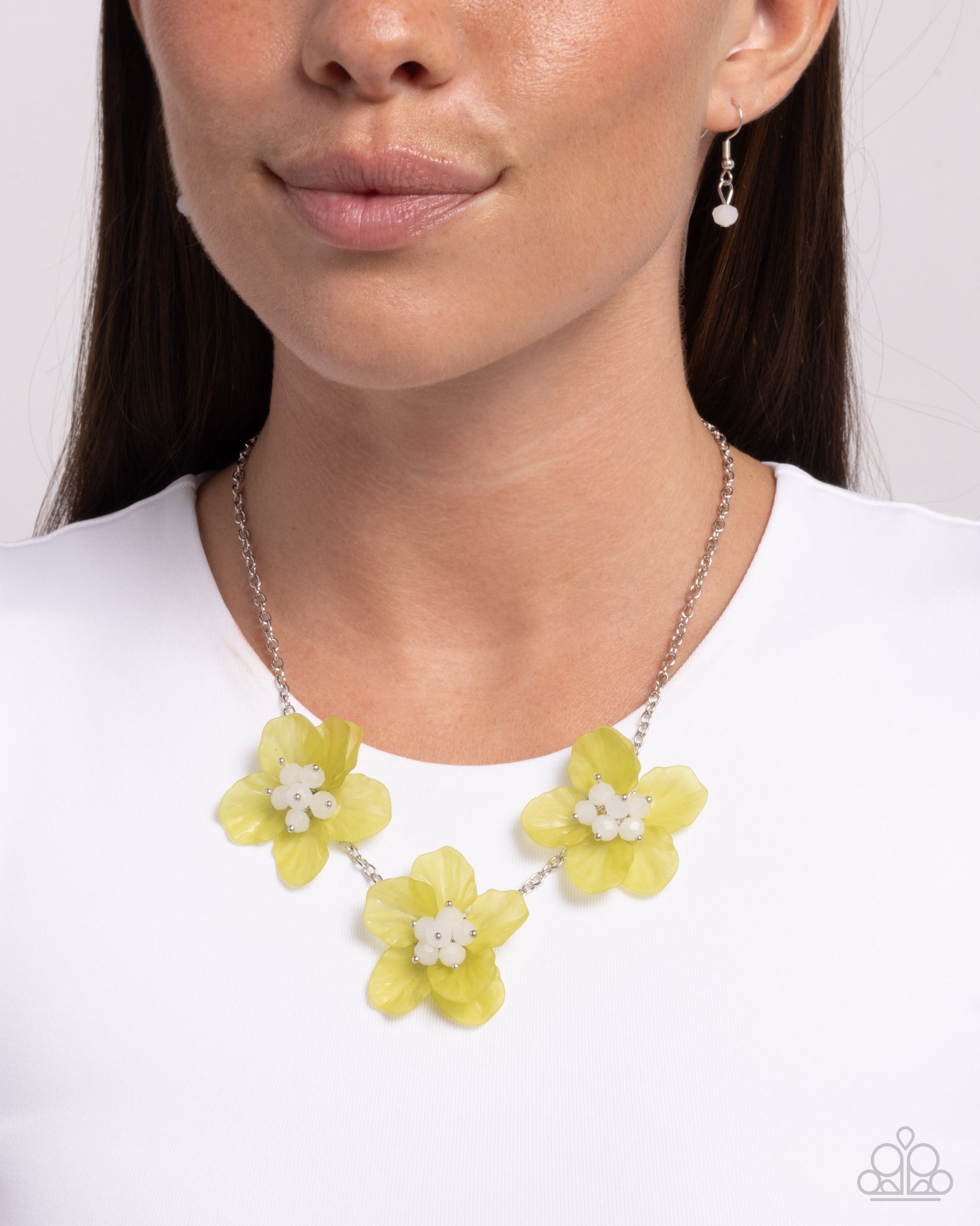 Three oversized Fern acrylic flowers, accented with clusters of white beads, bloom across the neckline from a silver chain. Features an adjustable clasp closure.