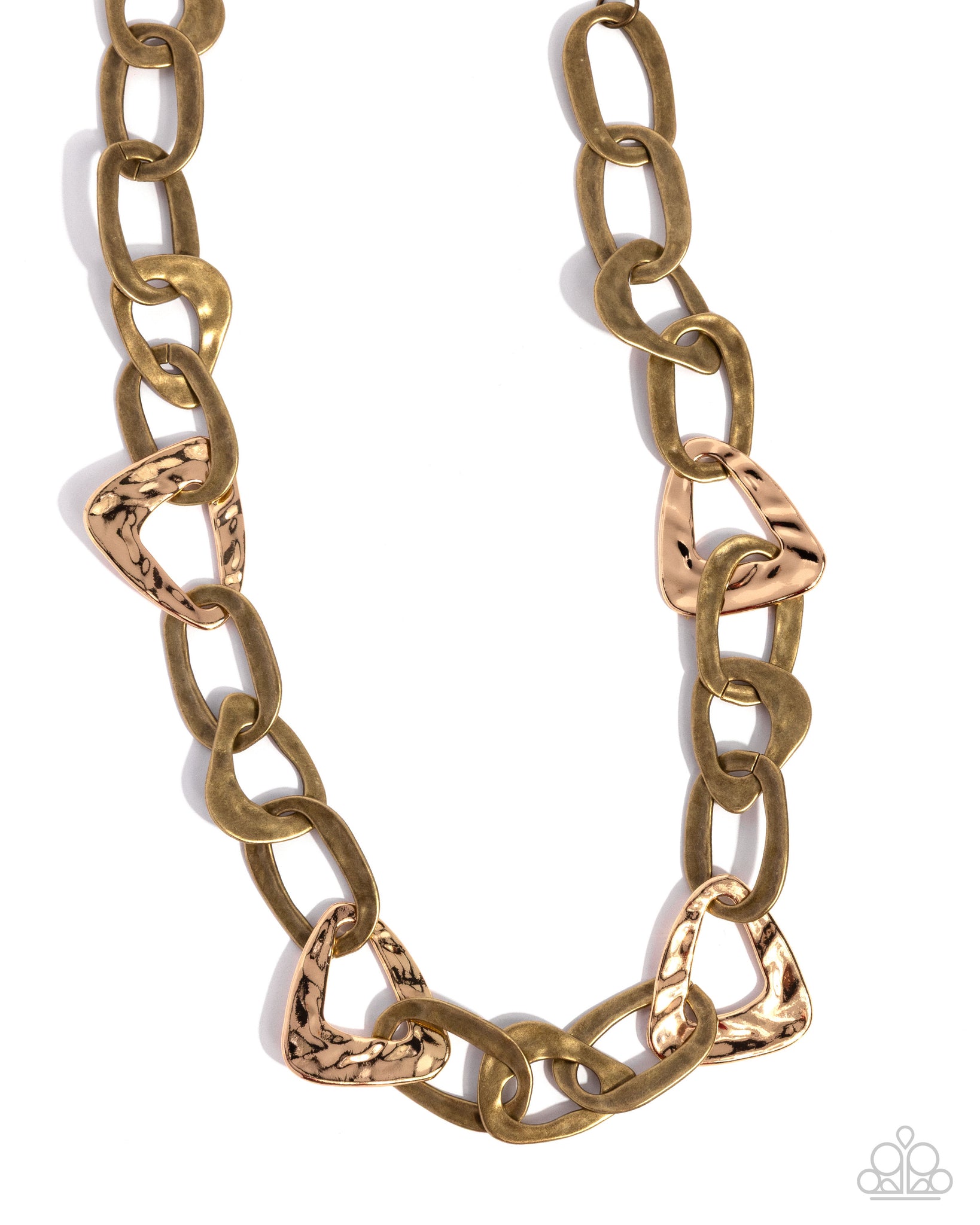 Oversized brass links connect with hammered gold triangular frames, creating a dramatic two-tone chain below the collar. The contrasting metals and high-sheen finishes lend a bold, industrial flair. Features an adjustable clasp closure.
