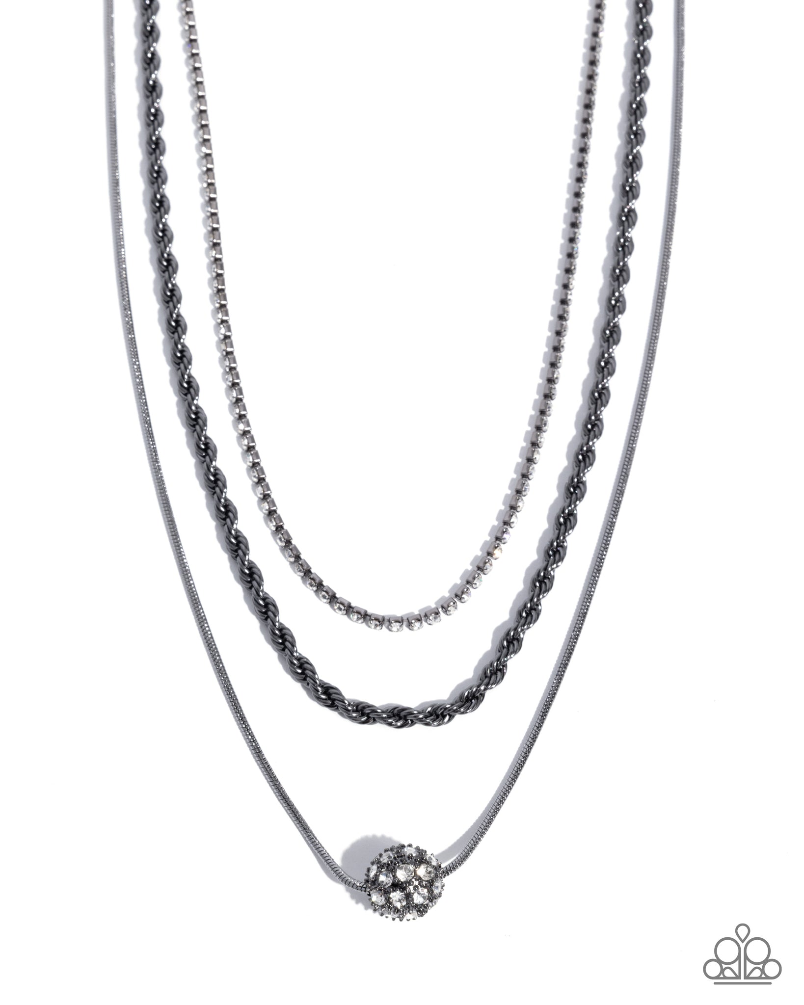 Three mismatched strands of white rhinestones in gunmetal square fittings, a gunmetal rope chain, and a gunmetal snake chain coalesce below the neckline in tiers for a heart stopping haute display. A white rhinestone-dusted gunmetal ornament glides along the lowermost chain for additional shimmer. Features an adjustable clasp closure.