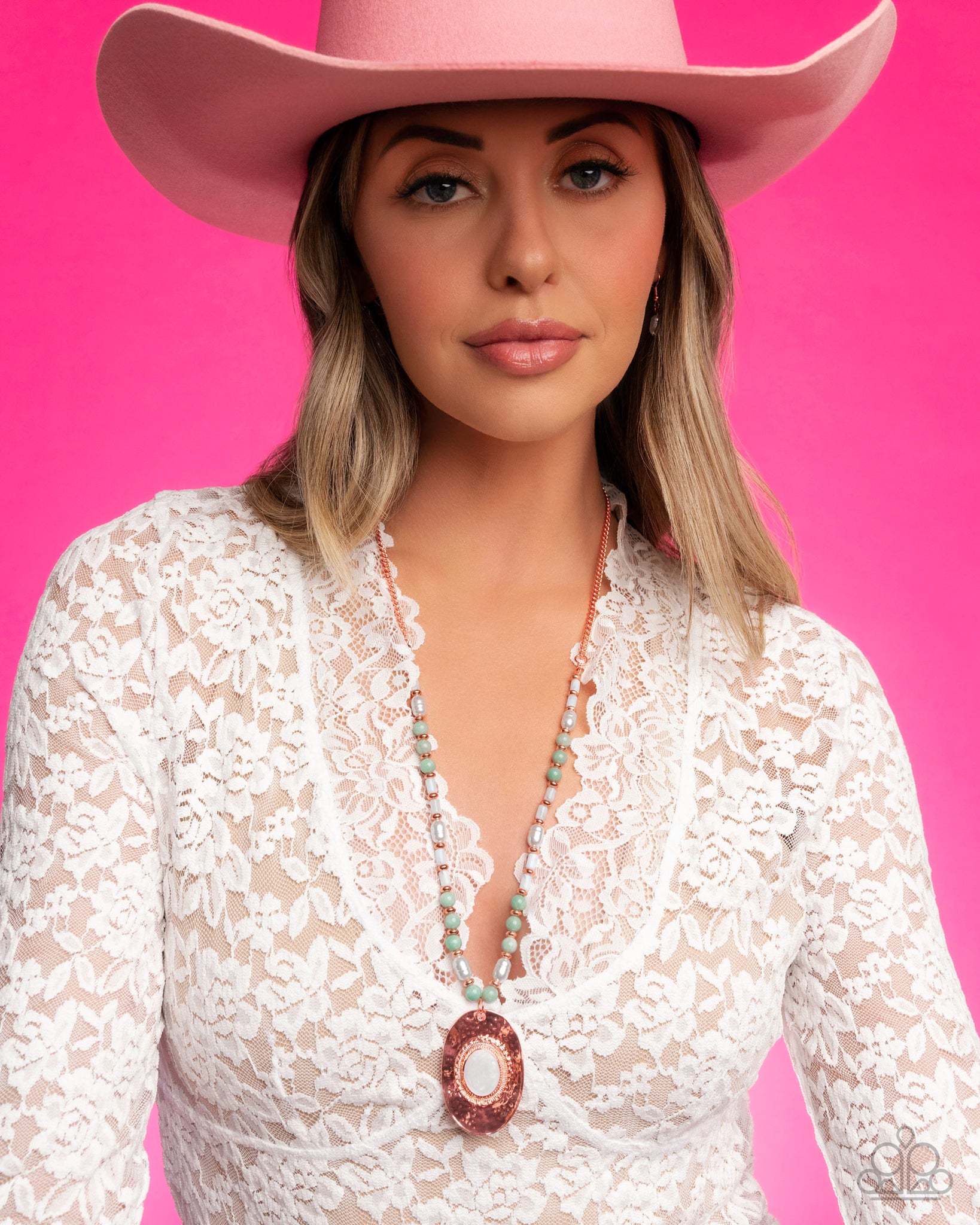 Infused along an invisible string, a collection of shiny copper discs, baroque white pearls, cylindrical cloudy Skylight beads, and round green stones pattern and coalesce below the neckline from a dainty shiny copper chain. An ivory pearl-painted oval glistens from the center of a hammered, subtly bent shiny copper elongated oval pendant at the center of the display for a whimsically worn look. Features an adjustable clasp closure. As the stone elements in this piece are natural, some color variation is normal.
