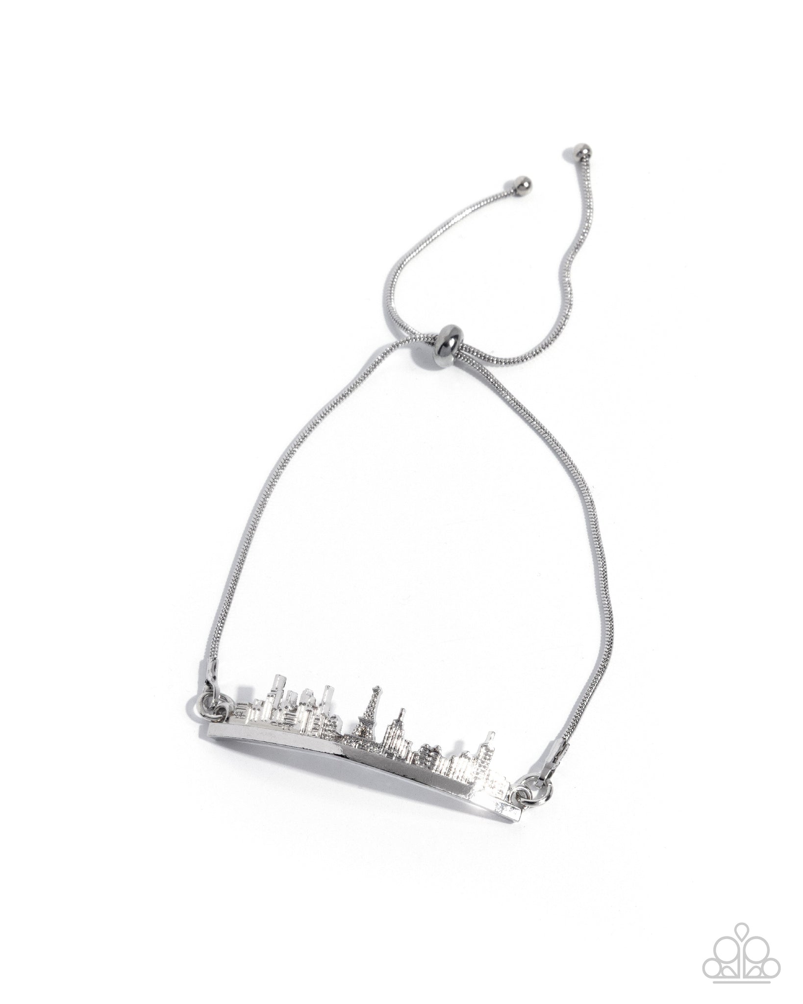 Rising up from a silver border, a French cityscape stands out atop the wrist for a polished, Parisian display. Features an adjustable sliding bead closure.