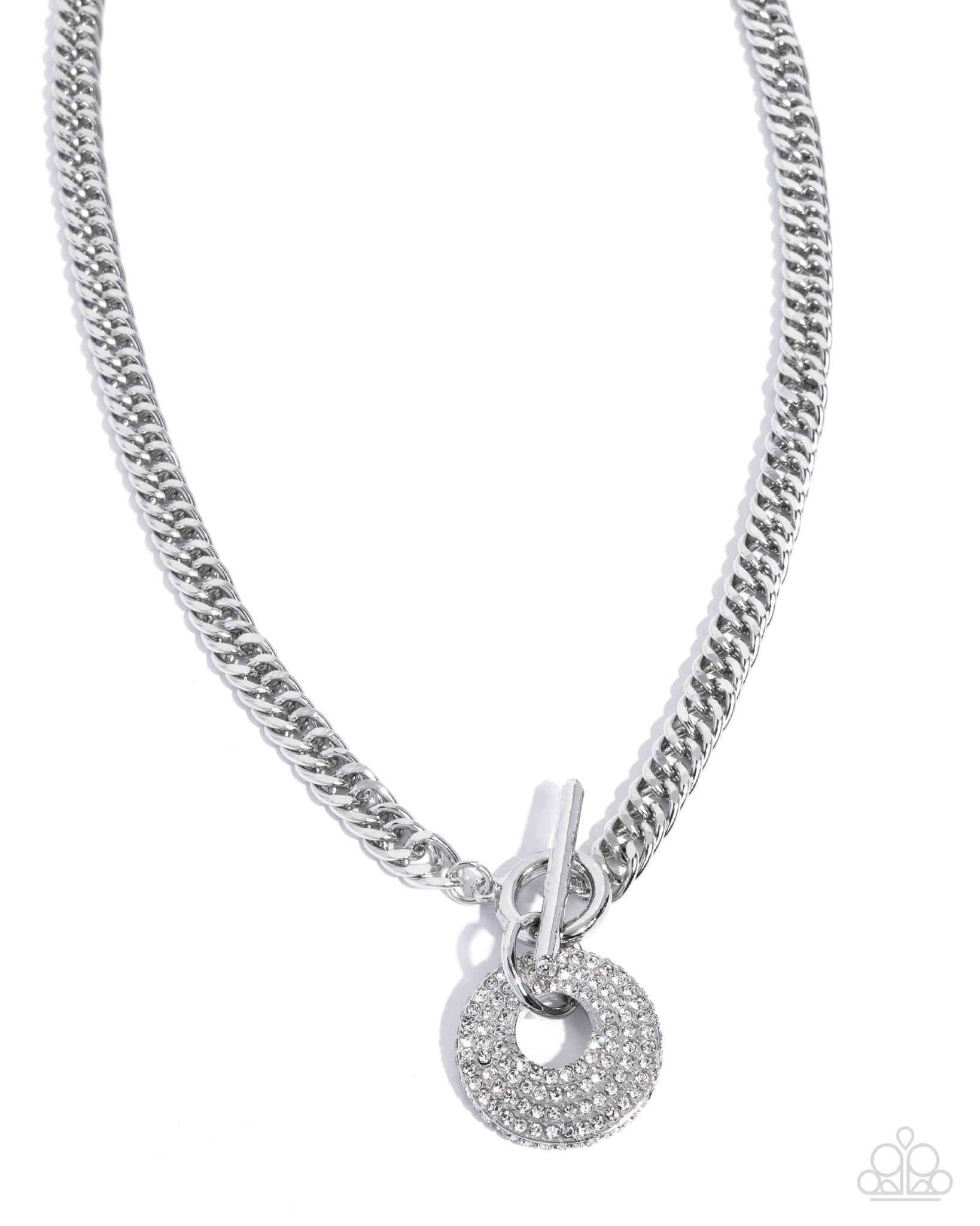 Embellished in row after row of white rhinestones, a silver ring sways below the neckline, connecting through a silver toggle clasp for a radiantly radical finish. Features an adjustable clasp closure.