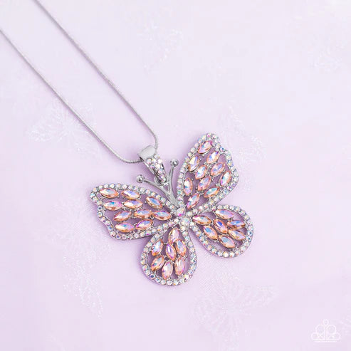Dotted in iridescent orange marquise-cut rhinestones, an airy whimsical silver butterfly flutters along a dainty silver snake chain below the collar in an enchanting fashion. Dainty white iridescent rhinestones glitz across the top of the pendant and the frame of the butterfly, accentuating the dazzling kaleidoscope of color within the wings. Features an adjustable clasp closure. Due to its prismatic palette, color may vary.