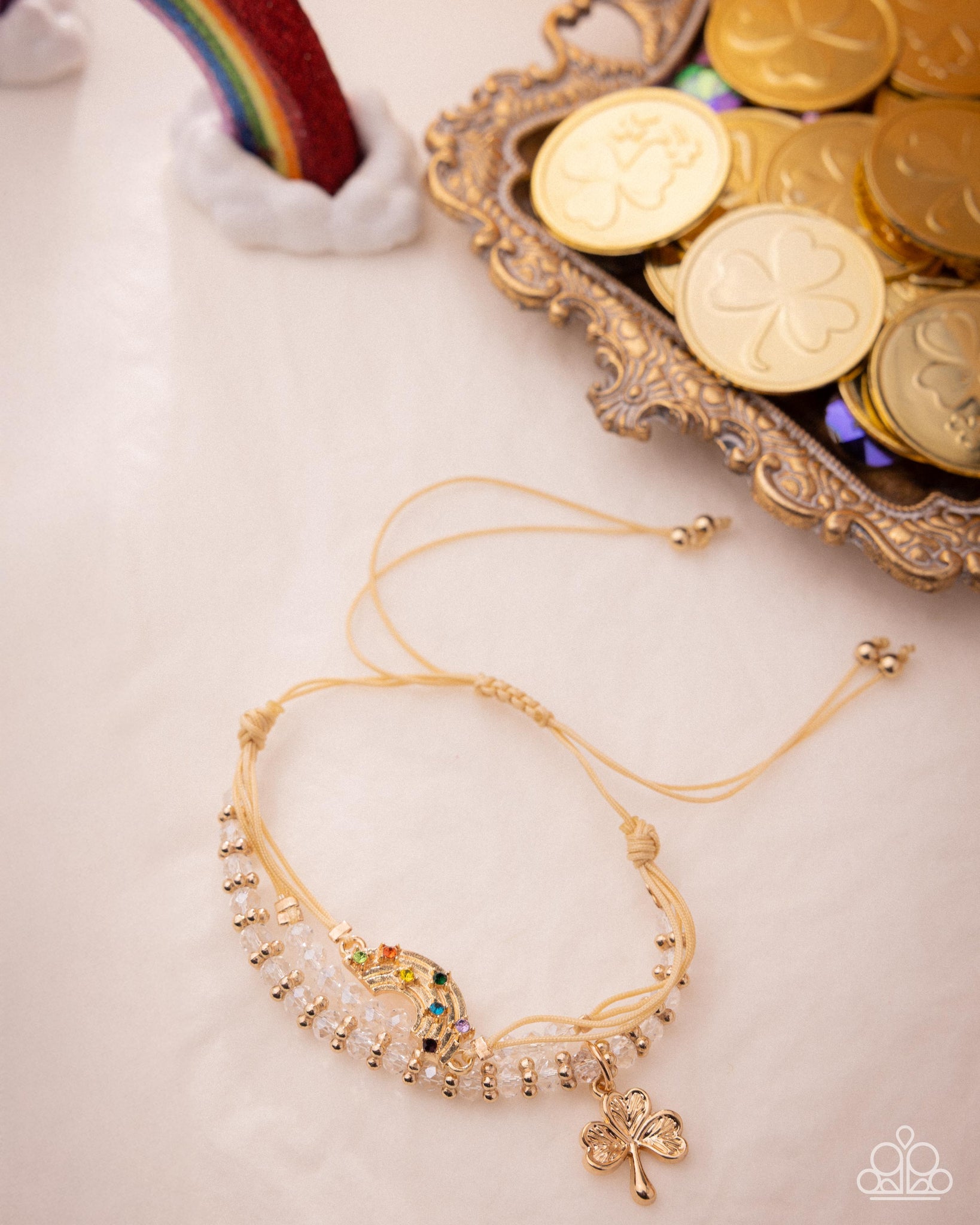 An array of gold floral beads, alternating with faceted clear beads, is sprinkled beside light brown cording that layers atop the wrist for a flashy display. A gold clover and gold rainbow, splashed with multicolored rhinestones, joins the stack for a St. Patrick's-inspired shimmery finish. Features an adjustable sliding knot closure.