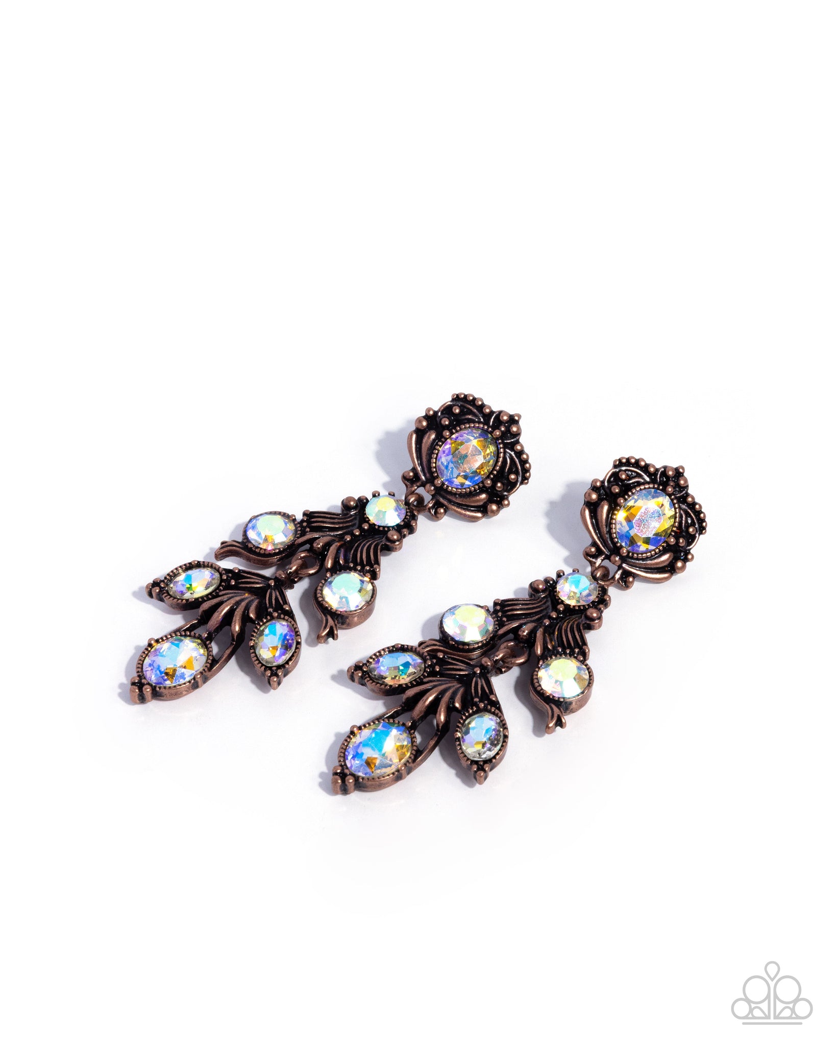 Featuring a faceted UV-shimmery finish, round and oval yellow gems are embellished atop a decorative copper frame swirling with royally studded detail and textured copper leaves for a timelessly over-the-top sparkle. Earring attaches to a standard post fitting.