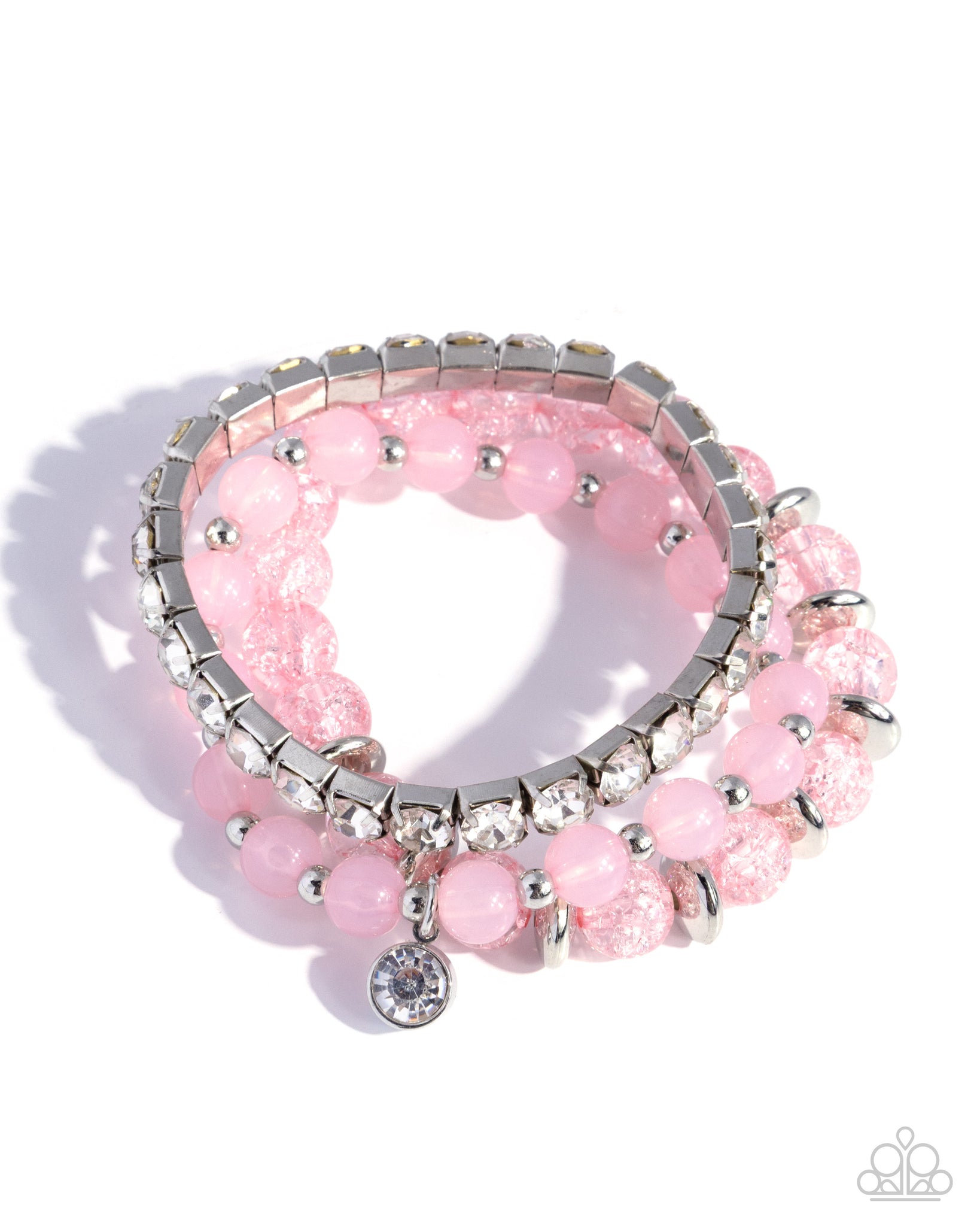 Pink beads in milky and crackle motifs join silver beads and discs, and a strand of white gems in silver square fittings along elastic stretchy bands for a colorfully chic stack. A highly faceted white gem in a round silver fitting sways from one of the strands for a flashy finish.