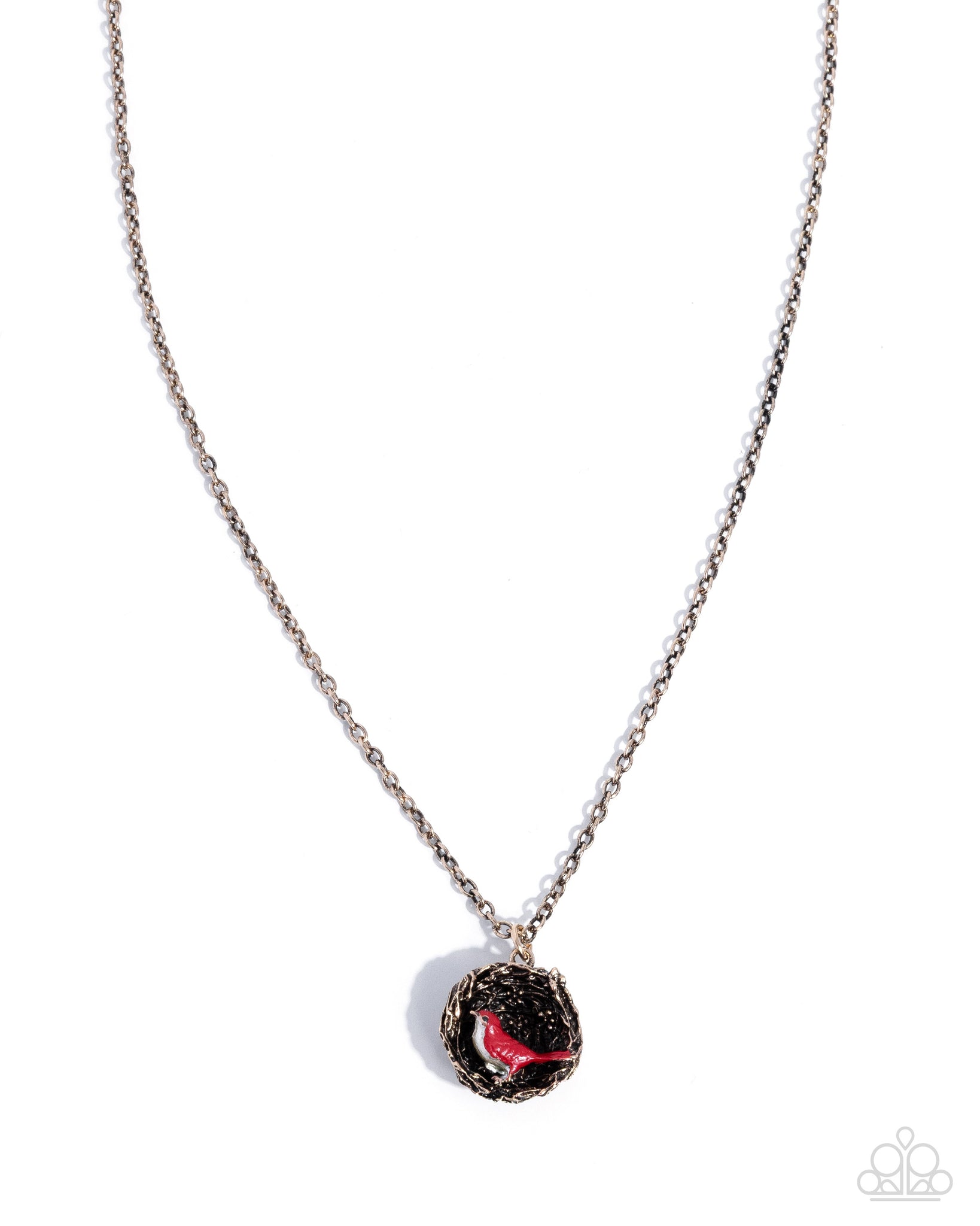 Gliding along an antiqued gold chain, an artisanal-inspired antiqued gold bird's nest, complete with a Poppy Red-painted bird, stands out below the neckline for a wildly whimsical display. Features an adjustable clasp closure.
