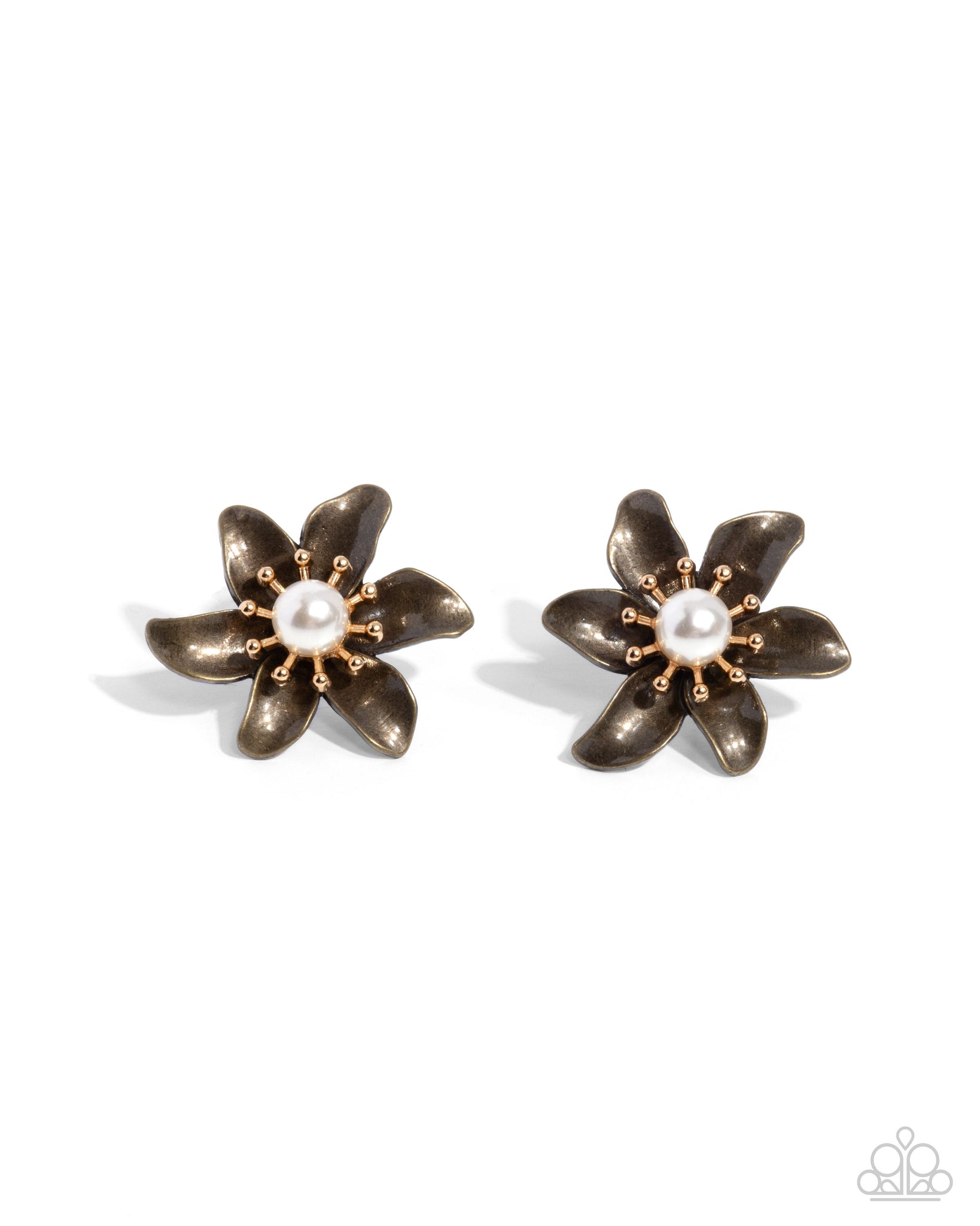 A glossy white pearl glistens in the center of a layered brass floral and gold studded sunburst frame for a whimsical delight along the ear. Earring attaches to a standard post fitting.
