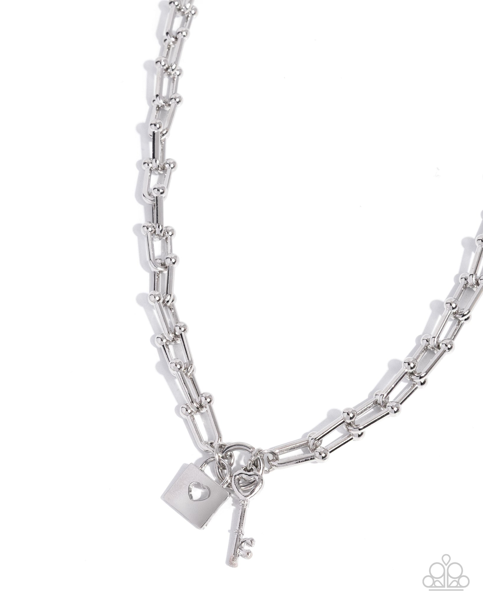 An oversized silver chain dotted with ball-tipped bars flaunts a whimsical smooth silver lock and a dainty silver key charm at its center. The charming duo dangles with just the right hint of romance and attitude, creating an unforgettable statement. Features an adjustable clasp closure.
