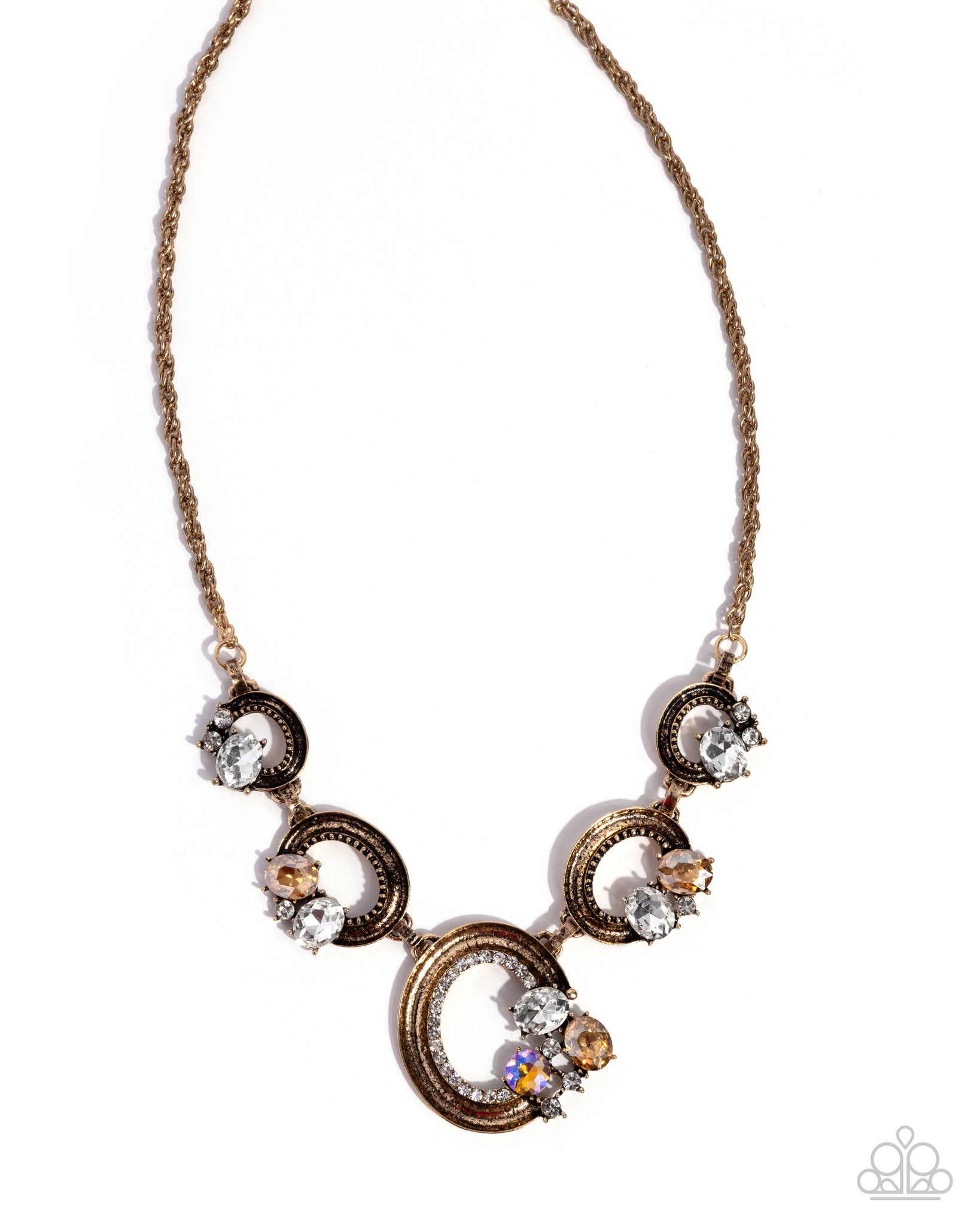 A dainty series of antiqued gold-studded rings are sporadically dotted in chic clusters of white, Golden Shadow, and Golden Shadow UV rhinestones and gems as they delicately link below the collar, from an antiqued gold rope chain, resulting in an effervescent display. Features an adjustable clasp closure.