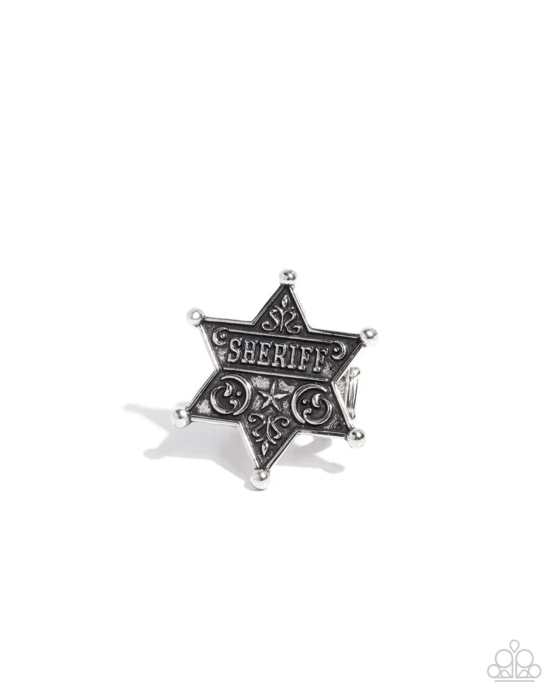 Featuring whimsical motifs and the stamped word "SHERIFF, " a silver star capped with silver studs glistens atop the finger on airy silver bands for a Wild West-inspired centerpiece. Features a stretchy band for a flexible fit.