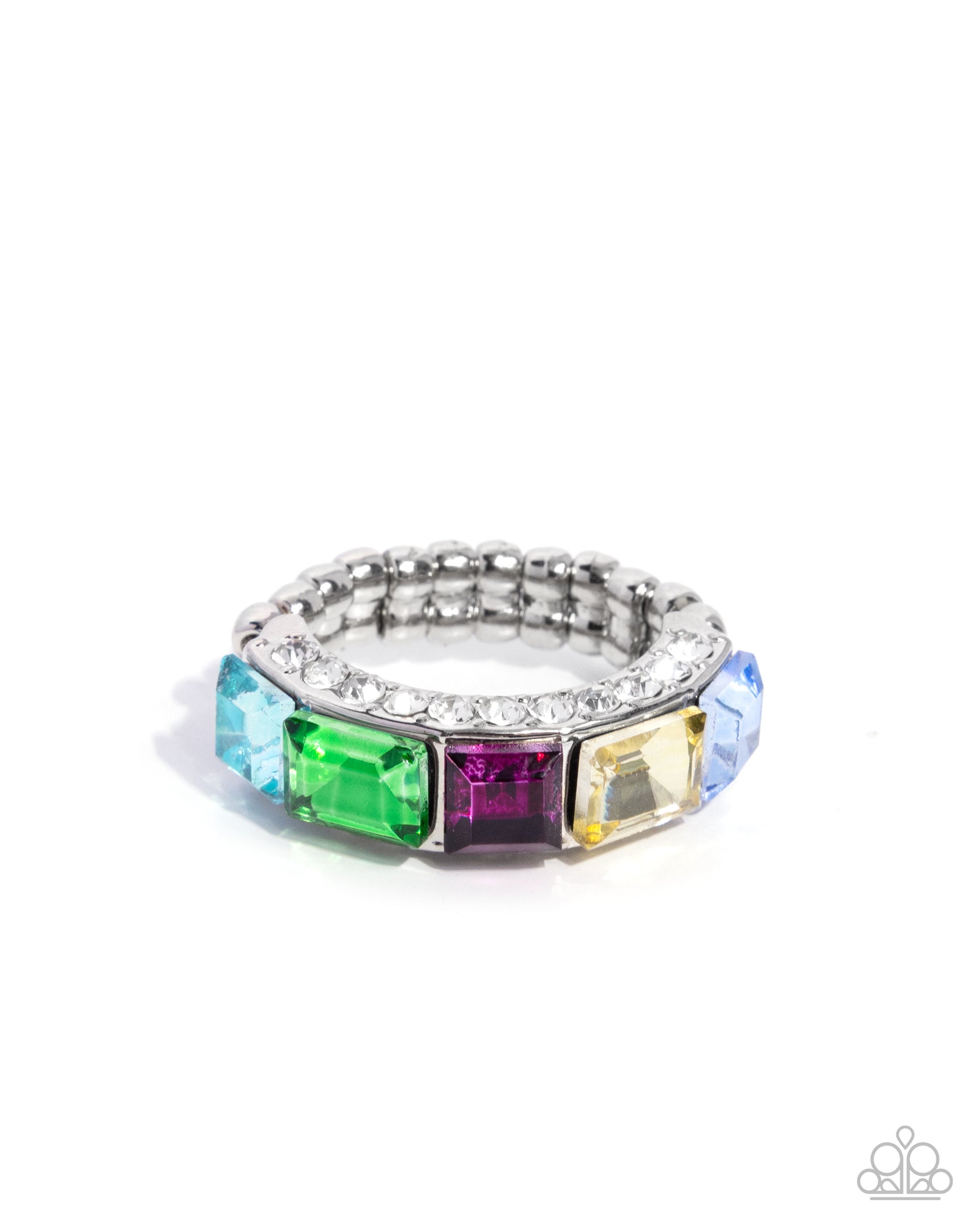 A row of emerald-cut rhinestones in vibrant shades of green, pink, yellow, and blue wraps around the finger for a spectacular rainbow effect. Smaller white rhinestones line the silver frame, amplifying its reflective sparkle. Features a stretchy band for a flexible fit.