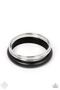 A set of three basic silver bangles stack together with a chunky black wooden bangle for a layered look.