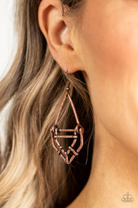 Brushed in a burnished finish, hammered copper bars and copper fittings attach into an edgy geometric lure for a versatile vibe. Earring attaches to a standard fishhook fitting.