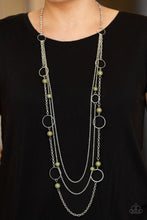 Featuring earthy green beads and shimmery silver hoops, mismatched silver chains layer down the chest for a seasonal look. Features an adjustable clasp closure.