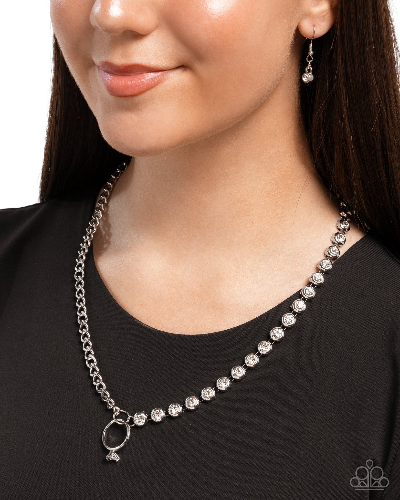 A strand of white rhinestones in abstract silver fittings collides with a silver curb chain to create an abstract blend of grit and glitz. The links of the curb chain offset the high sheen of the rhinestones that lay on the opposite side, perfectly balancing the contrasting design. Gliding below the center of the display, a princess-cut cubic zirconia is pronged atop a silver ring for an engagement-inspired elegant finish. Features an adjustable clasp closure.
