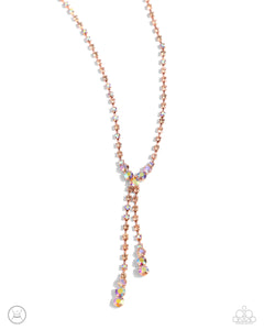 Featuring a sleek shiny copper square-fitting chain, a dainty glittery strand of peach, light-colored topaz, and iridescent-tinted light-colored topaz rhinestones stream around the collar for a refined flair. Varying in length, two strands of the same rhinestones encased in similar shiny copper square fittings stem from the bottom of the sparkly chain where bigger gems rest, creating an attention-grabbing display. Features an adjustable clasp closure. Due to its prismatic palette, color may vary.