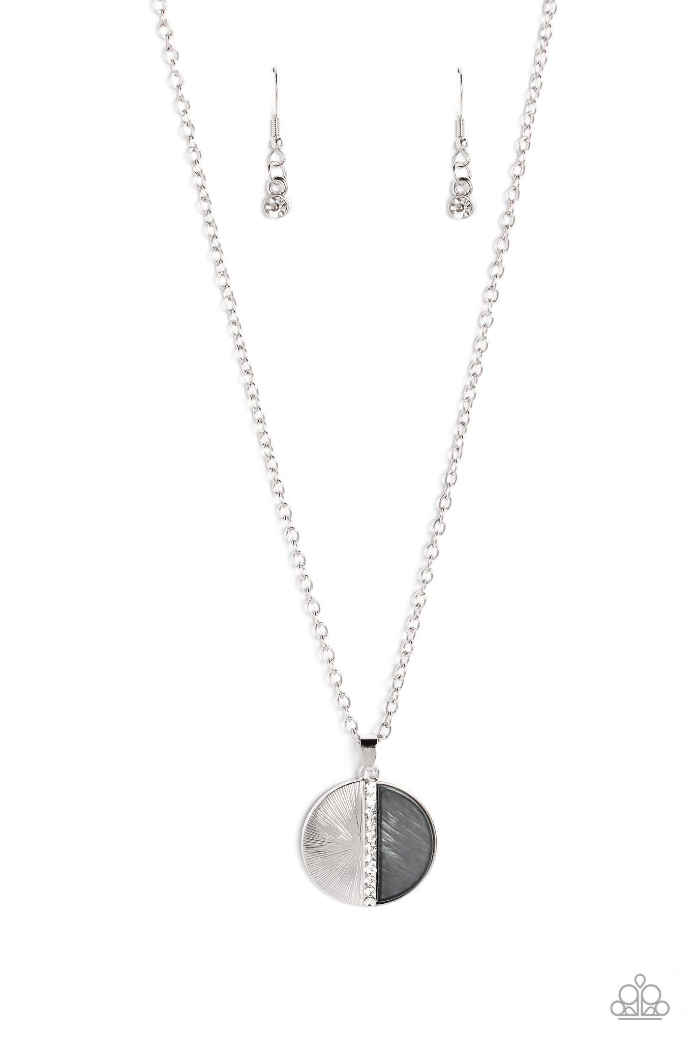 Embossed in radiant linear textures, a half-circle silver frame is nestled next to a half-circle gray shell for a colorful finish. White rhinestones dot down the center of the pendant for a spritz of glitz down the neckline. Features an adjustable clasp closure.