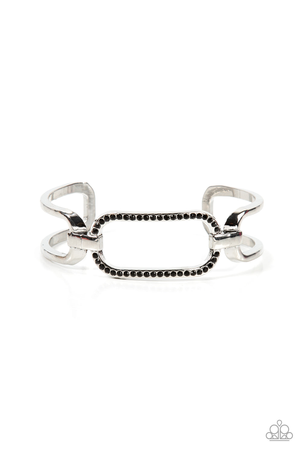Airy link-like silver frames attach to a black rhinestone encrusted centerpiece, coalescing into a chic cuff around the wrist.