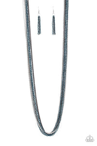 Brushed in a metallic finish, blue chains collide with mismatched gunmetal and silver chains across the chest. Shimmery silver and gunmetal popcorn chains join the colorful layers, adding shimmery metallic texture to the spunky mixed palette. Features an adjustable clasp closure.
