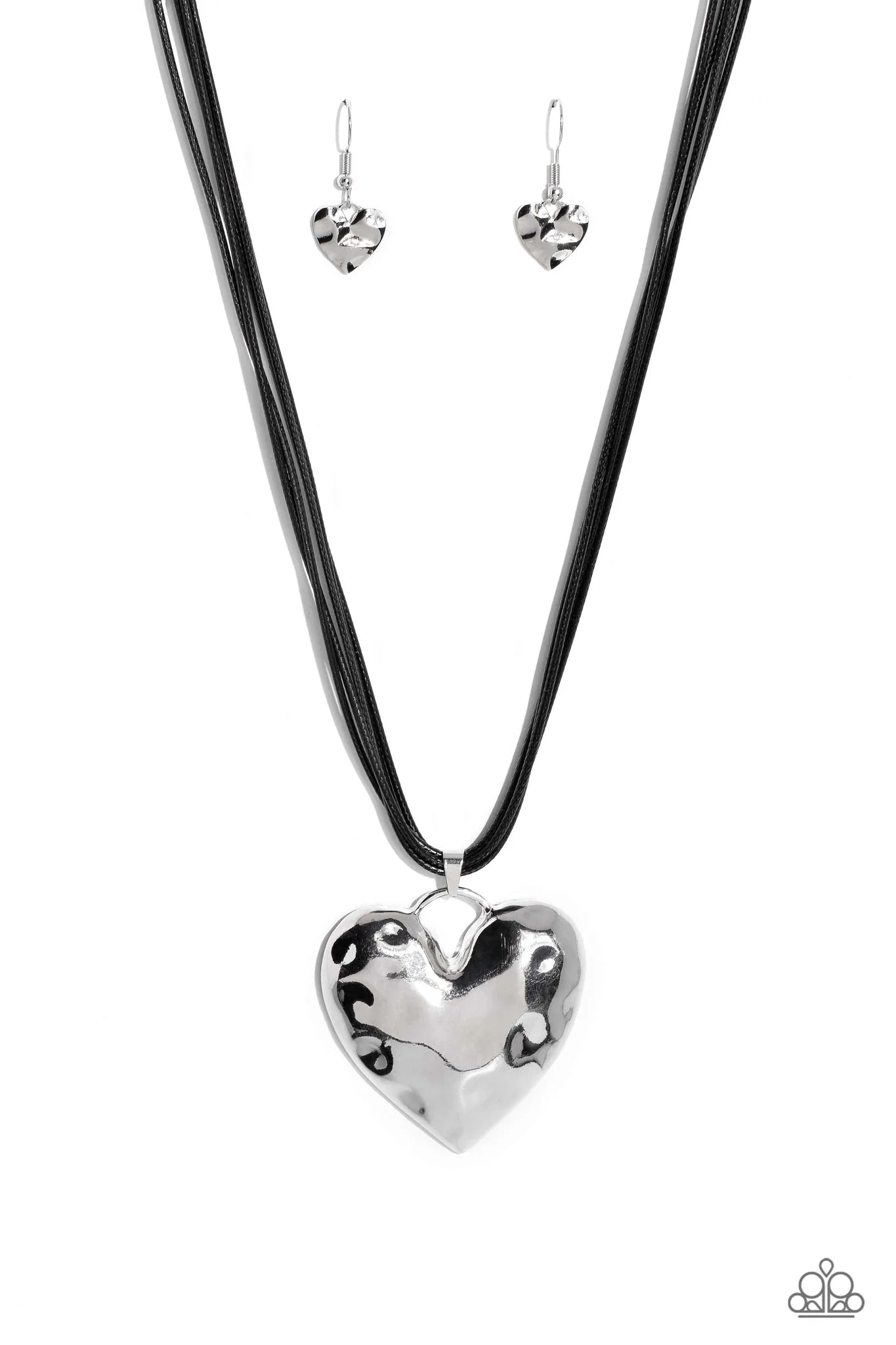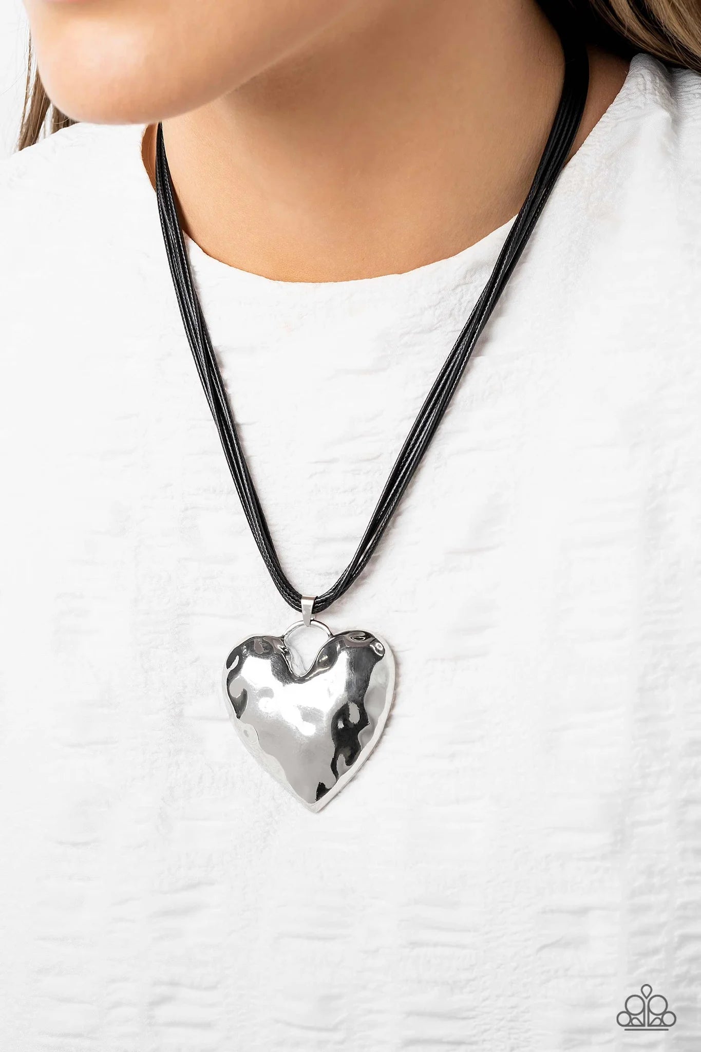 An oversized, silver heart pendant featuring a hammered sheen, falls down the neckline at the end of black cording for an alluring appeal. Features an adjustable clasp closure.