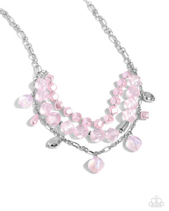 Cubed baby pink pearls join a strand of baby pink clear acrylics that alternate with silver discs and a silver fitting around the neckline. A third strand joins the refined display featuring a silver abstract chain that has dangling silver beads, baby pink pearls in a variety of shapes, and glittery clear acrylics for a classy display. Features an adjustable clasp closure.