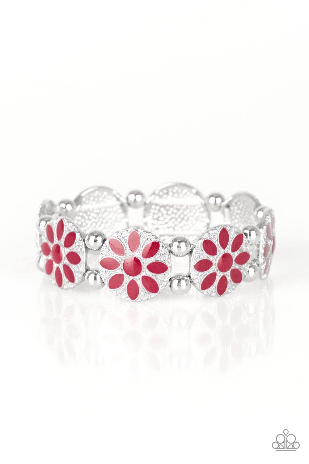 Painted in a rich red finish, ornate silver floral frames are threaded along a stretchy band across the wrist for a seasonal look.