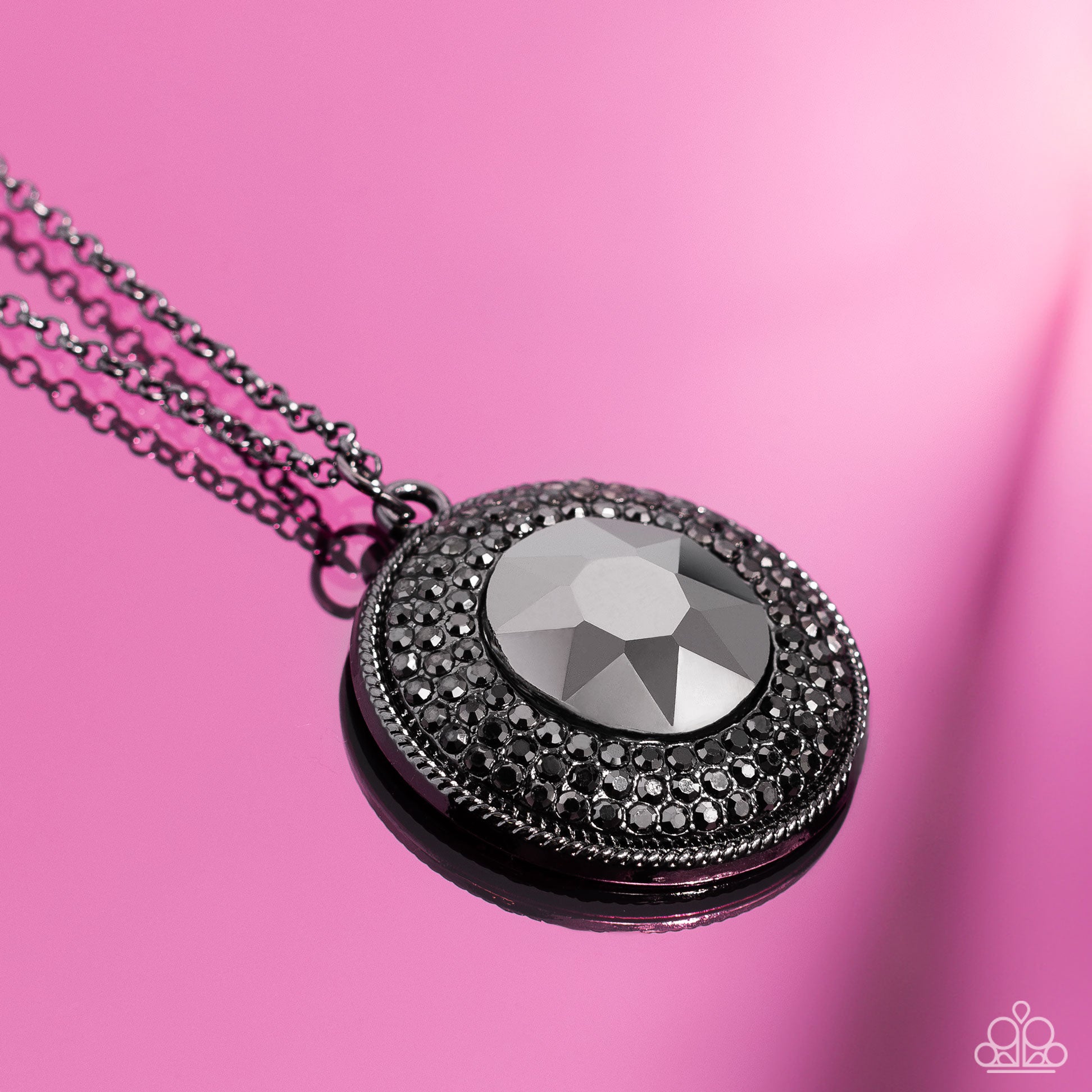 Sparkling with an oversized hematite center, a concaved gunmetal disc encompassing radiating rows of shimmering hematite rhinestones cascades from an elongated gunmetal chain, creating a striking impact. Features an adjustable clasp closure.