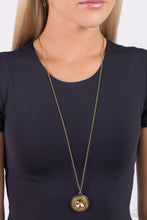 Sparkling with an oversized aurum center, a concaved brass disc encompassing radiating rows of shimmering aurum rhinestones cascades from an elongated brass chain, creating a striking impact. Features an adjustable clasp closure.