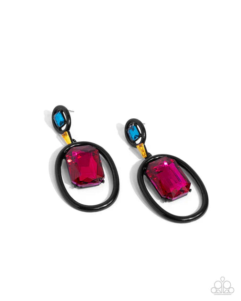 Pronged in a black-painted fitting, a blue rounded emerald-cut gem gives way to a chiseled yellow gem which then gives way to an oversized fuchsia, emerald-cut gem suspended along the top of an oversized black-painted hoop for a compelling chic lure. Earring attaches to a standard post fitting.