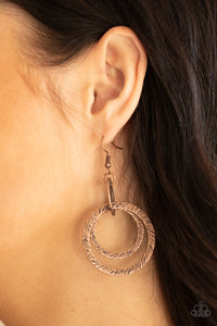 Etched and embossed in shimmery textures, a trio of antiqued copper hoops interlock into a dizzying lure. Earring attaches to a standard fishhook fitting.