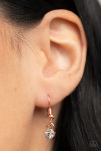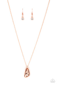 An asymmetrical coppery gem is pressed into a shiny copper frame dusted in glassy white rhinestones, resulting in a refined pendant at the bottom of a dainty shiny copper chain. Features an adjustable clasp closure.