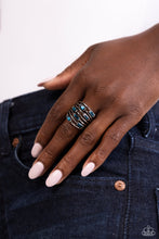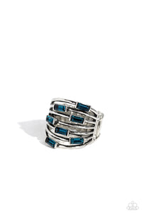 A staggered collection of refreshing blue emerald-cut rhinestones haphazardly adorn layered silver bands, creating a glitzy grit. Features a stretchy band for a flexible fit.