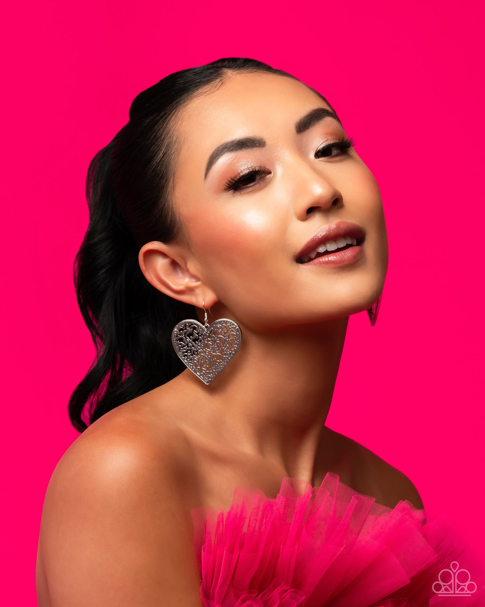 A shiny, oversized silver heart is filled with swirls of filigree, emitting vintage whimsy as it swings from the ear. Earring attaches to a standard fishhook fitting.
