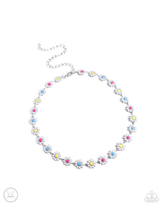 Featuring hot pink, yellow, and turquoise-painted centers, a collection of white-painted silver daisies encircle the collar for a summer-inspired statement. Features an adjustable clasp closure.