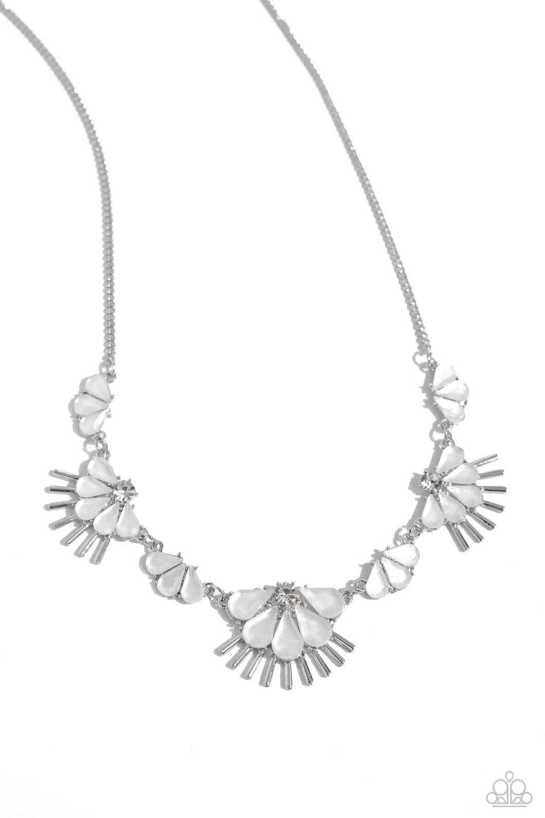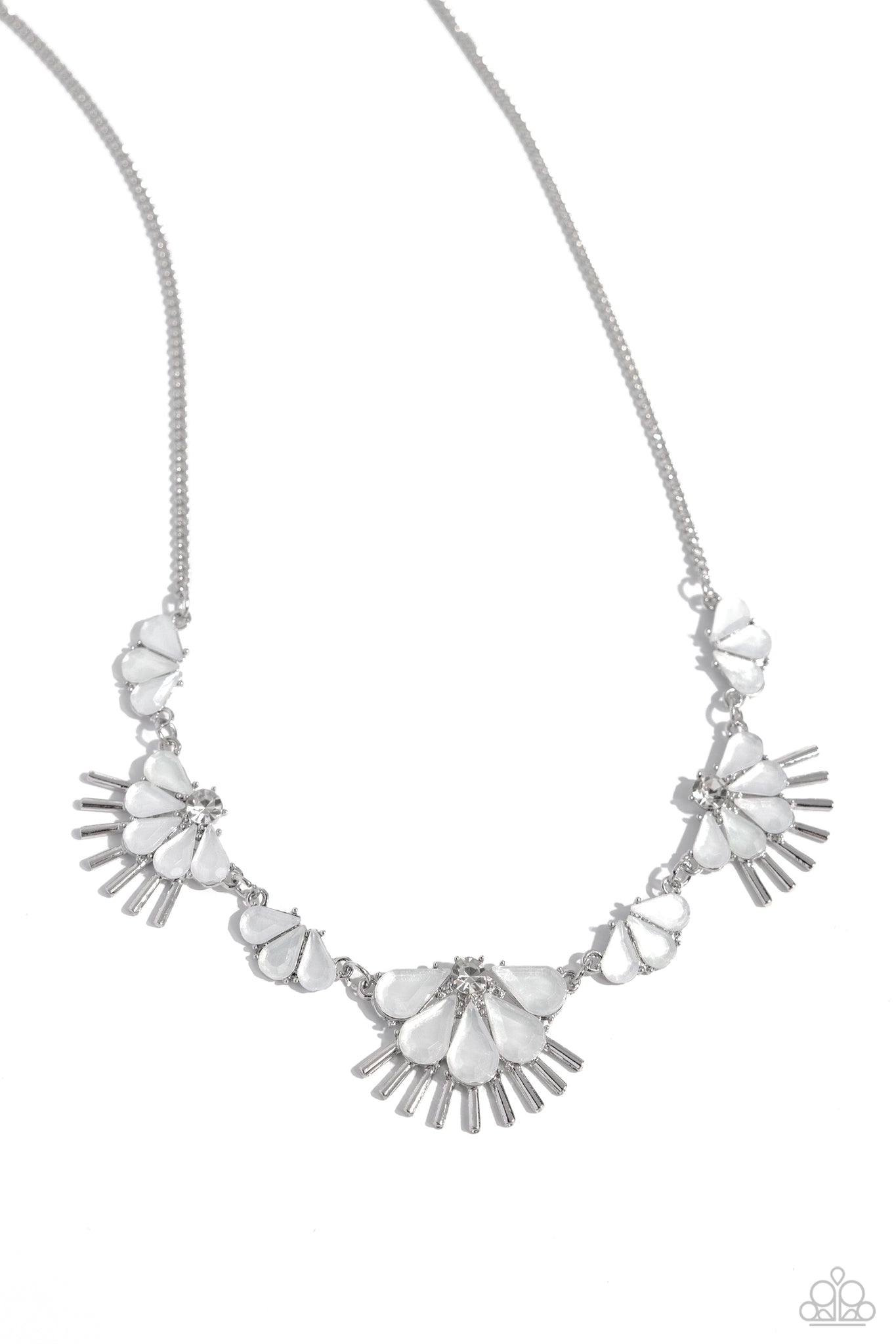Three milky white teardrops, set in dainty pronged fittings, alternate with solitaire white rhinestones that give way to a cluster of larger milky white teardrops. Sleek silver bars flare out from the exaggerated teardrop display creating a fan-like arrangement along the neckline for a sense of refinement. Features an adjustable clasp closure.