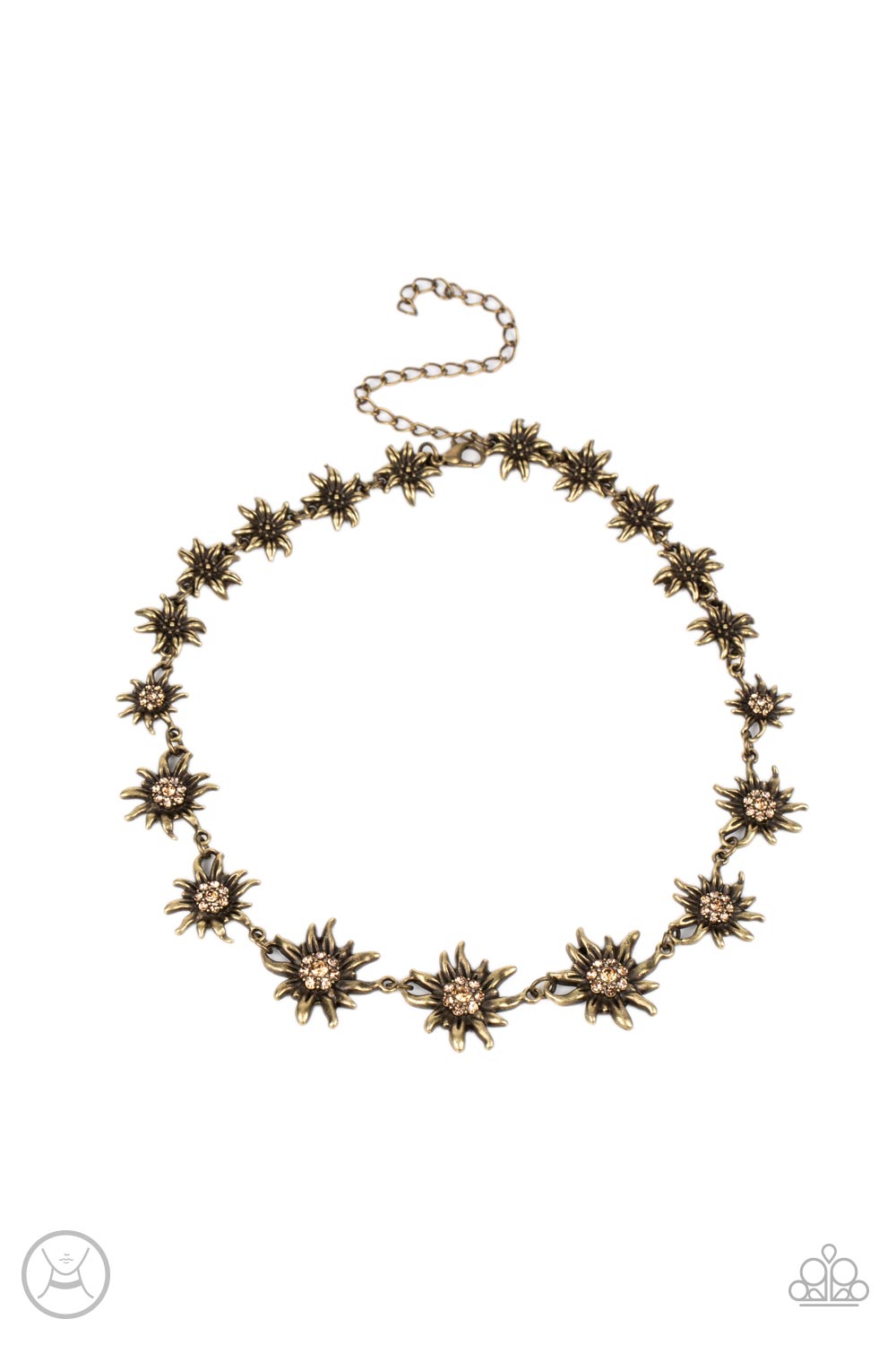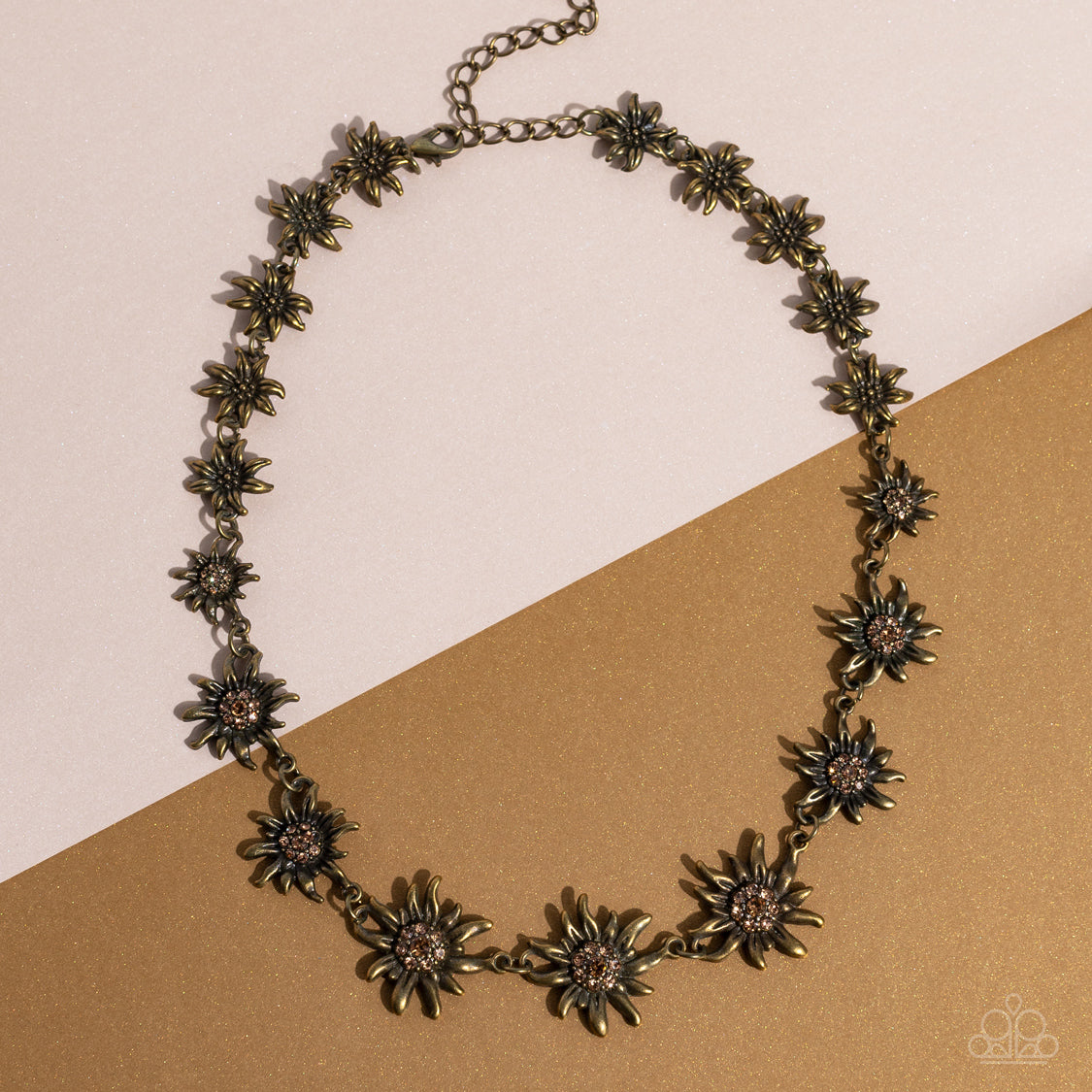 Featuring studded brass or topaz rhinestone encrusted centers, lifelike brass daisies gradually increase in size as they link around the necklace for a fashionably floral display. Features an adjustable clasp closure.