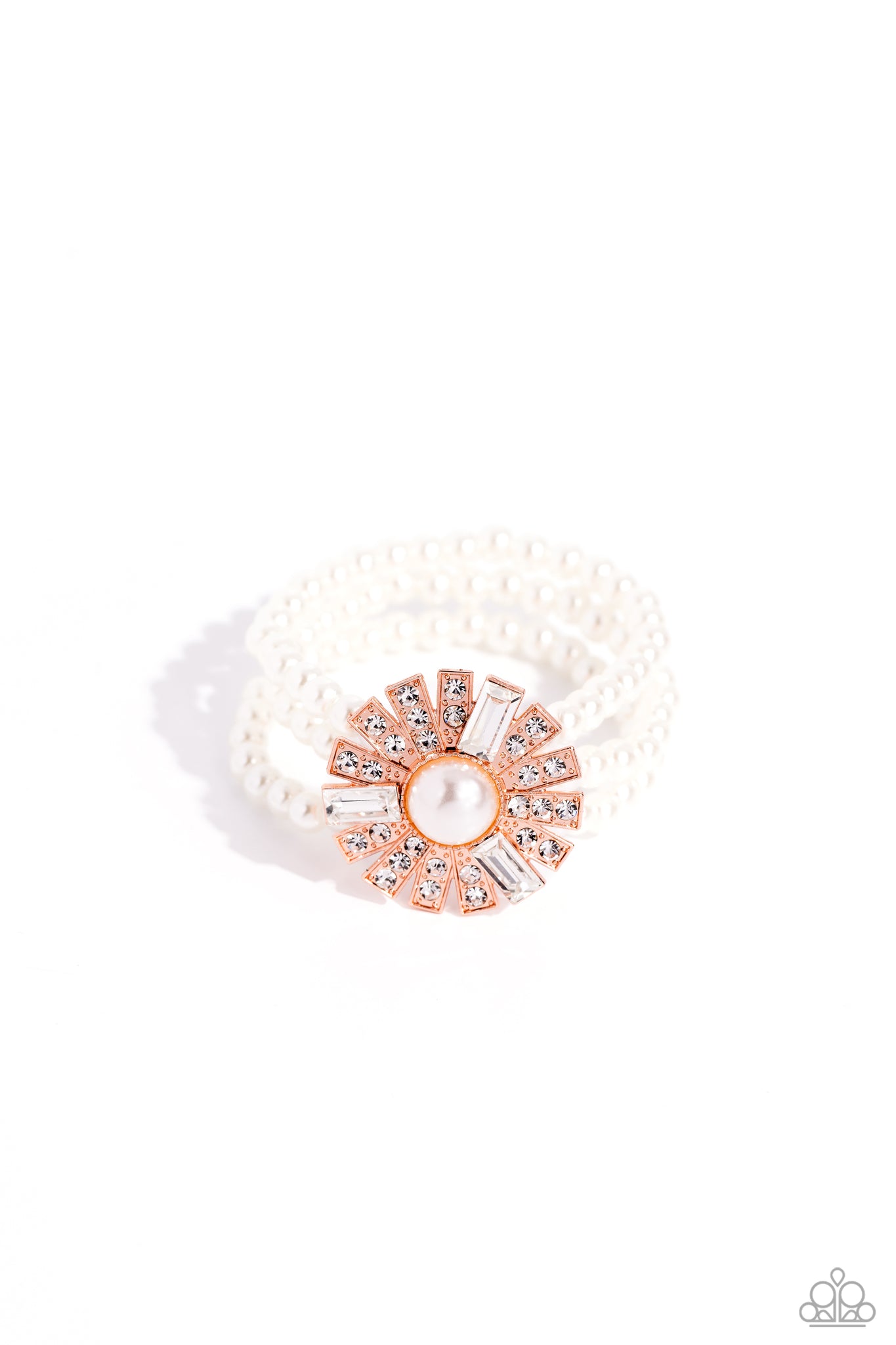 Strung along elastic stretchy bands, three bands of pearls wrap around the wrist. Featured atop the pearly collection, sleek shiny copper metal bars flare out from a mesmerizing pearl center, creating a stacked rhinestone-encrusted fringe of fanning frames. A trio of emerald-cut white gem bars are sprinkled across the dazzling display for a sassy finish.