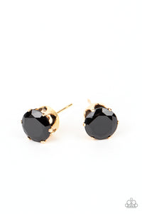 An oversized black rhinestone is nestled inside a pronged gold fitting, creating a timeless statement piece. Earring attaches to a standard post fitting.