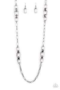 Sections of oversized clear acrylic and bold gunmetal links connect with an exaggerated gunmetal chain across the chest, creating an intense industrial display. Features an adjustable clasp closure.